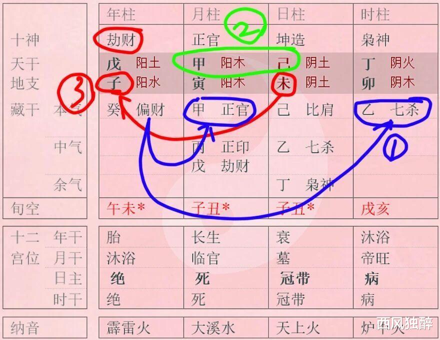 在八字中,天干的夫星为“明”,地支的夫星为“暗”。夫妻宫和子孙宫是命主自己家,命主自己家里住的是七杀,在暗处。但命主却跟不在家里的正官相合——家里有,外面还有。