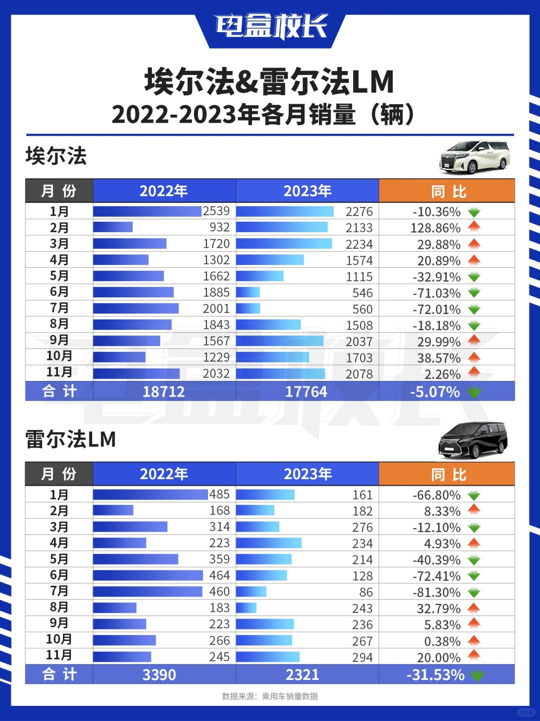 埃尔法和雷尔法2022年和2023年前11个月的销量变化的图,我放在下面了。虽然几乎有一半的时间,这两款车都在增长,但是拉通全年来看,相比于2022年前11个月,埃尔法和雷尔法LM的销量都出现了下滑,埃尔法下滑了5.07%,雷尔法LM下滑了31.53%,分月份来看,两款车型都主要集中在年中的这几个月,也就是5、6、7、8这几个月。