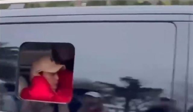 画面中,身穿红色外套的张颂文坐在奔驰商务车内,将一包白色物体抛向窗外。