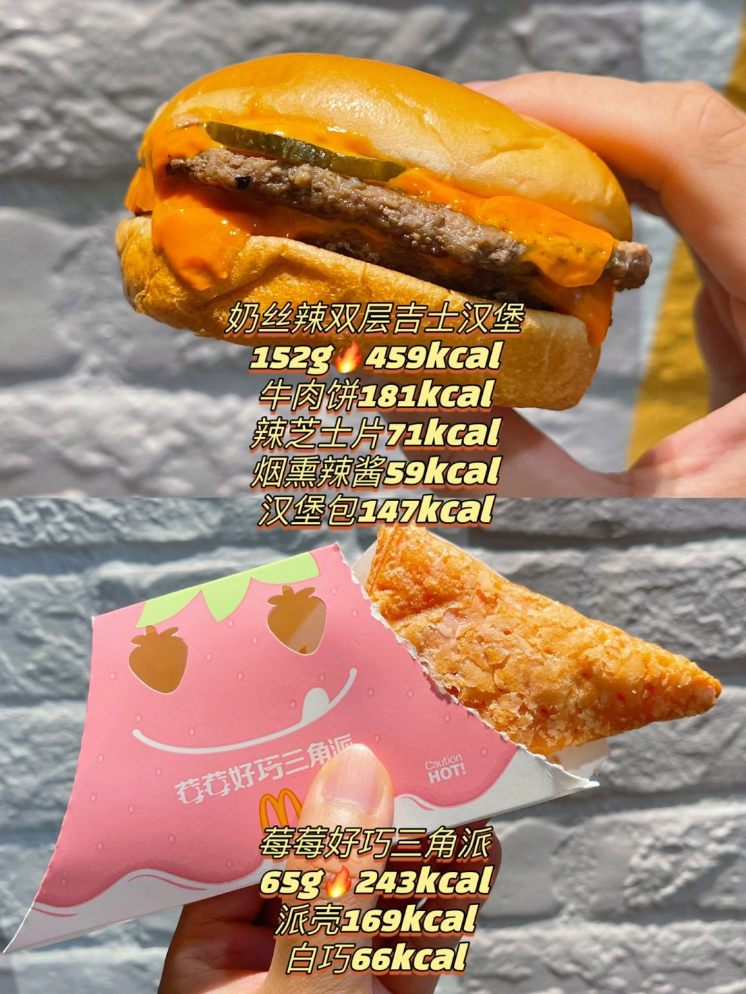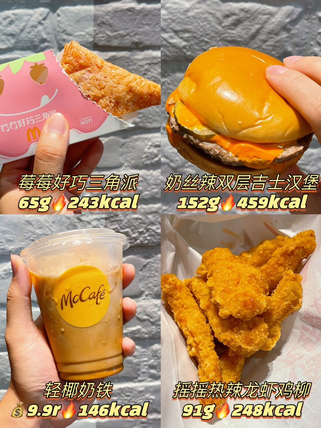 哈哈哈哈哈哈,还是不能让孩子们失望,实在是等不到明天早上给各位仙女们更新了,来啦来啦! 奶丝辣双吉不是骗人的,真的会有点辣,但是又不是很辣的那种,不是广东辣,可是巧克力派就真的甜,明天孩子们可以安心冲了! 这次新品惊喜还是这杯轻椰奶铁,真的好喝! 麦当劳 麦门 麦当劳热量 减肥 热量 热量测评 麦当劳新品 麦旋风 双层吉士汉堡 麦当劳穷鬼套餐 奶丝辣双层吉士汉堡 莓莓好巧三角派 摇摇热辣龙虾风味鸡柳 轻椰奶铁