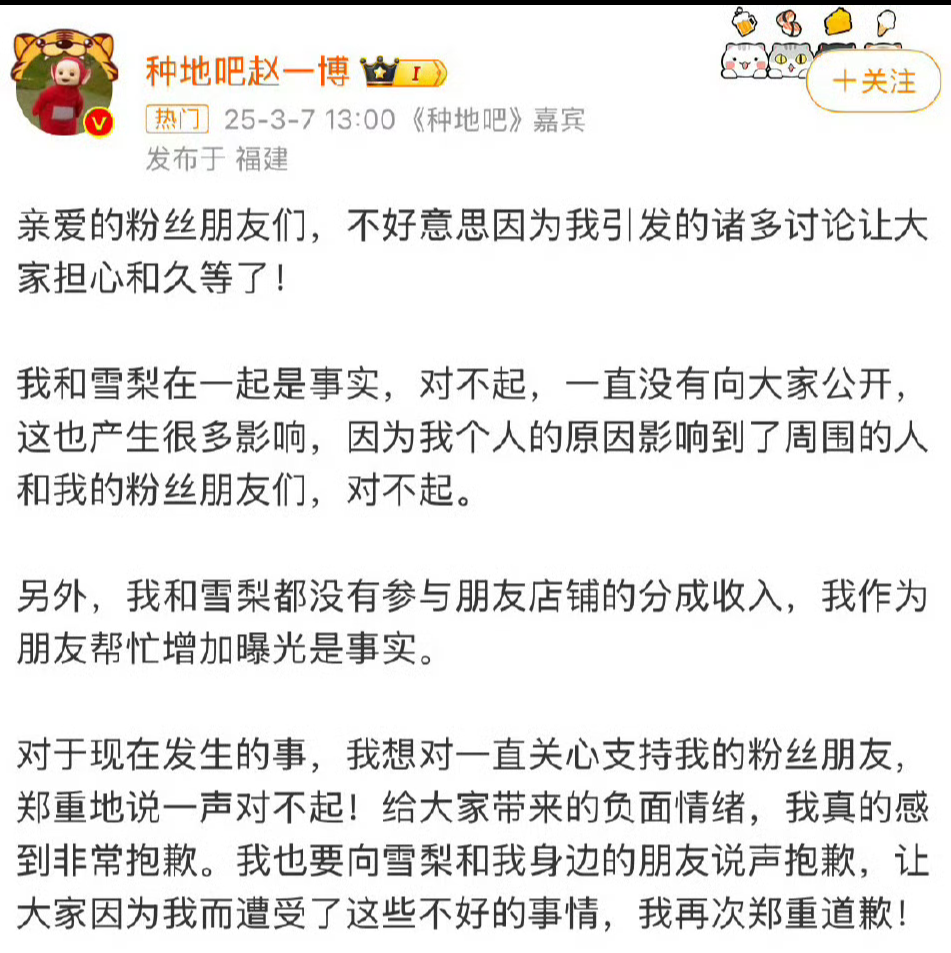2025年3月7日,赵一博在社交平台发文承认与雪梨的恋情,并向粉丝和受到影响的人道歉。他表示,两人在一起是事实,一直没有公开产生了许多影响,对此深感抱歉。