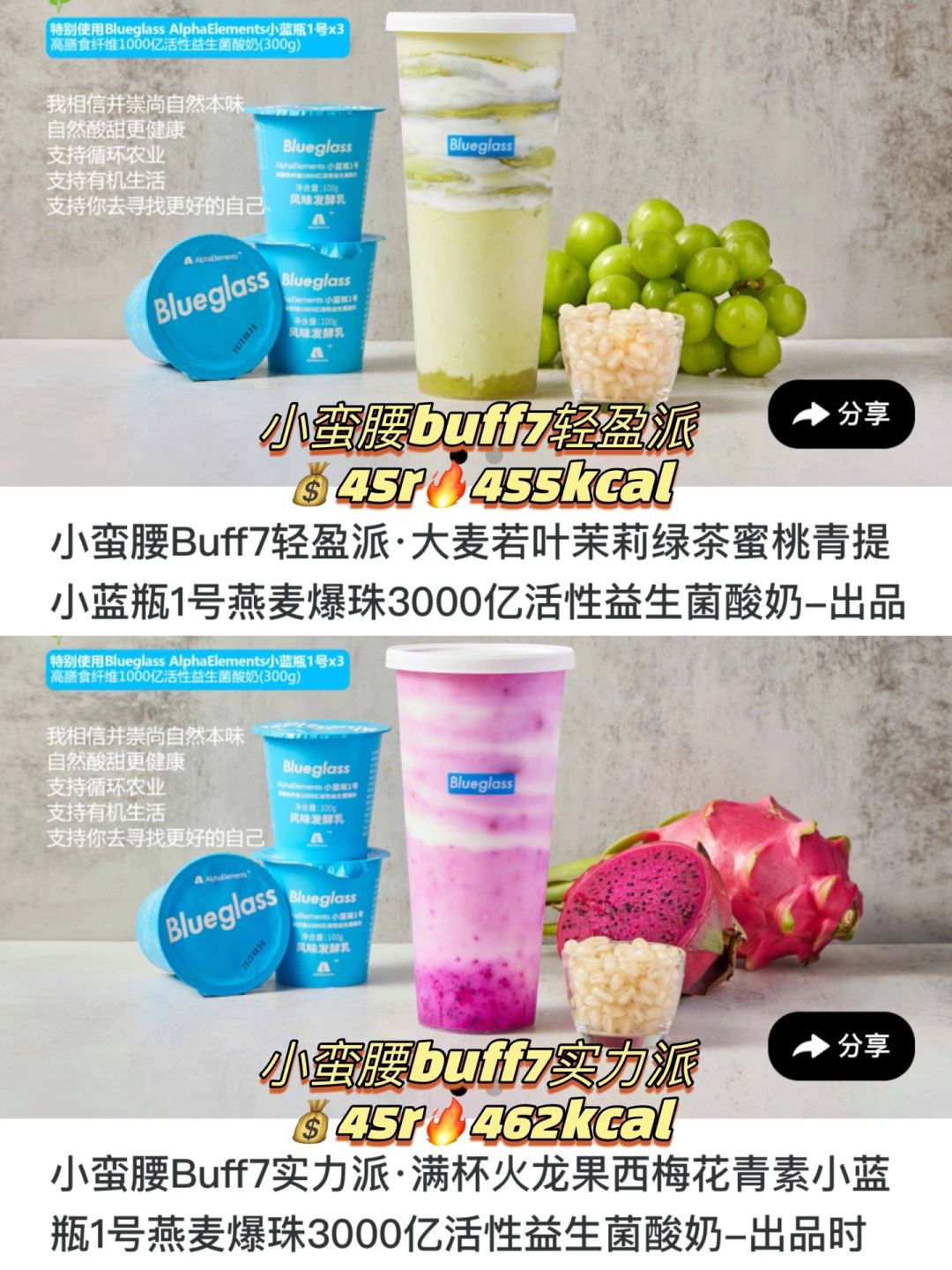 早早早[太阳R][太阳R][太阳R] buff7比上一期又多了一杯小蓝瓶,膳食纤维加量! 小黄袋的两杯好好喝的,笑🐭,原来金银花还可以这样用!bg黑芝麻的不用说了,永远是我的top,U1S1我觉得怎么搭配都是好吃的,榛子系列也很不错,反正两个小黑杯必须试一下,哈哈哈哈,太喜欢了!