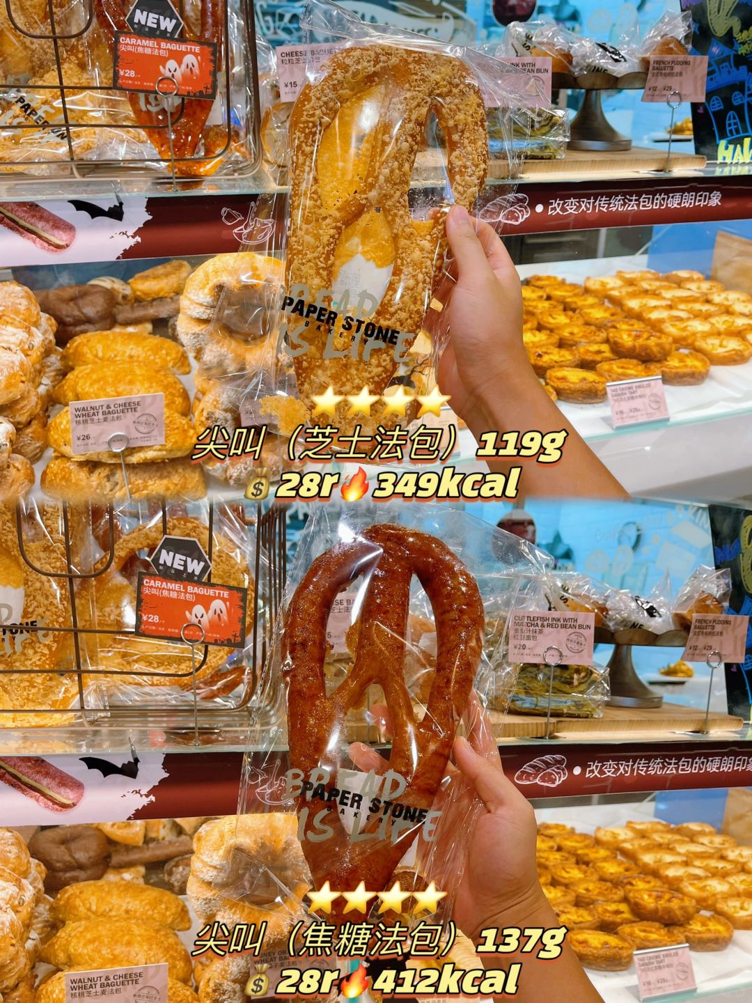 [太阳R][太阳R][太阳R]早啊早,又妥妥的拖更,原本昨天大家就可以去买包包了,迟到啦大家! PS真的太会整了,还得是纸石头啊,面包脑袋的节日气氛! 🎃尖叫(焦糖法包):PS的焦糖招牌工艺用在法包身上了吃起来太快乐了 🎃尖叫(芝士法包):爱吃车打芝士的冲冲冲,就是撒满芝士的面包干 🍤香川芝味小龙虾米面包:这个真的太惊艳了,真的伤心自己到现在才吃到,真的容不下3个被分走1个 🌭️巨肉肠蛋沙:永远要相信PS的各种巨肉肠包包,妥妥的一顿面包饭