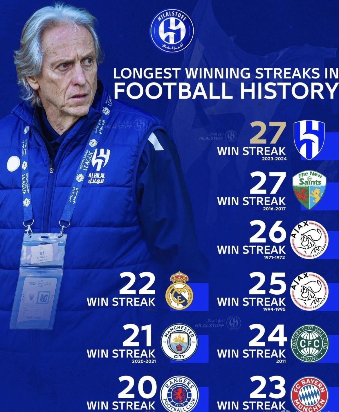 27连胜,利雅得新月做到了,这也追平了足球史上最长的连胜纪录,并且它领先联赛第二名12分,可以说联赛冠军基本是收入囊中,那么本赛季利雅得新月还有这几个悬念等待揭晓: 1.会不会以不败的战绩夺得沙特联赛冠军,目前是21胜2平,那么谁会击败利雅得新月也是备受关注。 2.米特罗维奇是否会超过C罗拿到金靴,目前C罗在联赛进了22球,米特罗维奇是20球,双方咬得很紧,如果C罗被超过,那么这个赛季可真是“四大皆空”了。相反内马尔躺着再拿冠军,无疑是有些太幸运了。 3.总进球数会不会破百,目前利雅得新月是进了70球,联赛还剩下11轮,以利雅得新月均场3球的效率,这个目标比较容易实现,原本以为买那么多大牌球星只是来养老的,没想到他们来到利雅得新月,还要为新的目标而打拼。