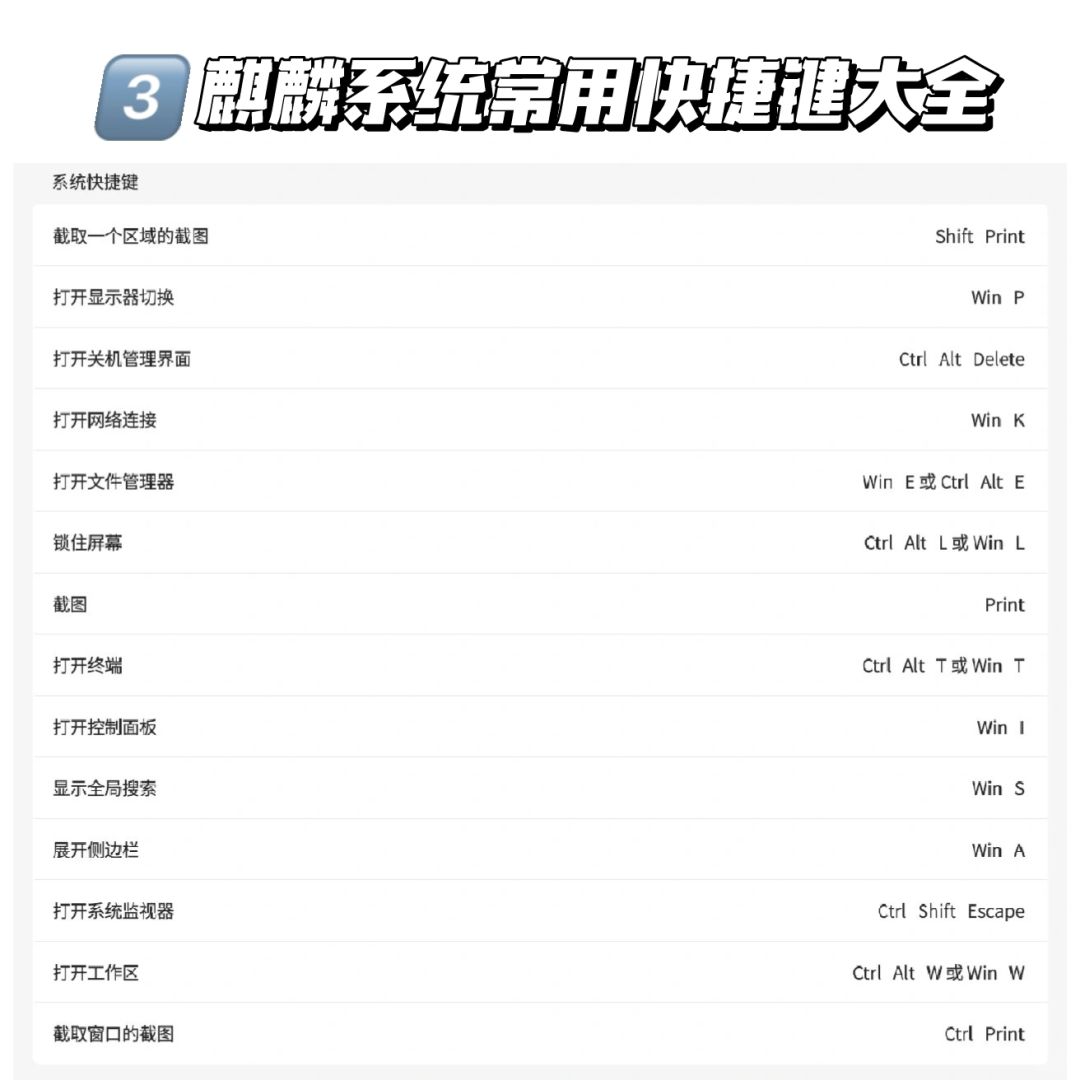 (篇幅有限,剩下的麒麟等系统专用快捷键整理见图片)