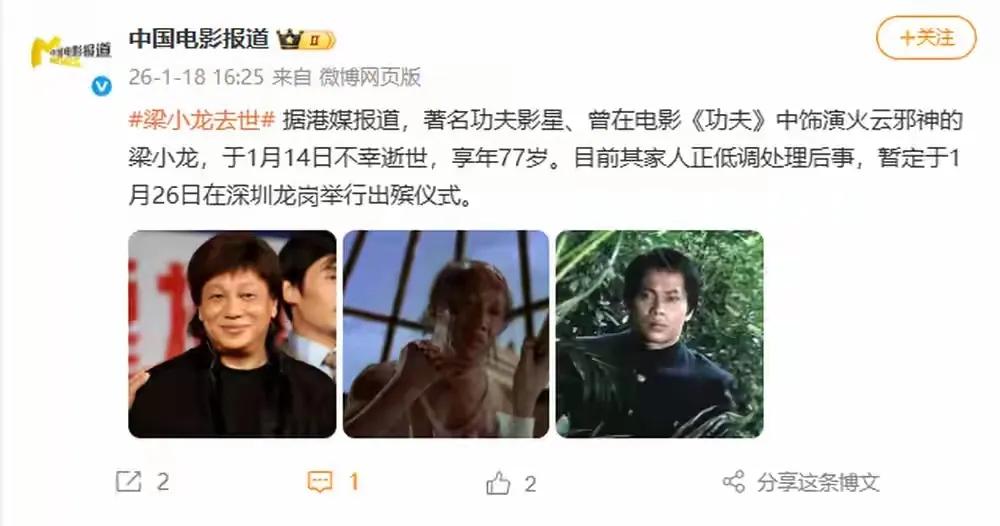 华语武打影坛再失一位传奇巨匠:1月18日,《星岛头条》《香港01》等权威港媒陆续披露,著名功夫影星梁小龙于1月14日不幸与世长辞,享年77岁。消息经其友人证实后,迅速引发两岸三地影迷集体悲痛,而家人正低调处理后事,暂定于1月26日在深圳龙岗举行出殡仪式,让这位扎根两岸影视界的功夫巨星,在他深耕多年的土地上走完最后一程。