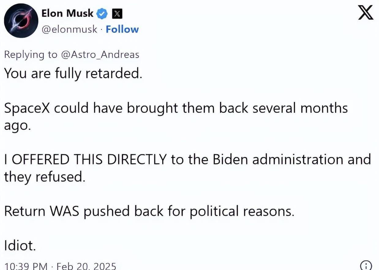 话说回来,特朗普就开始拿拜登开涮了:“你们原本可不敢在那种地方待上9个月,结果出了这种悲剧,全都是因为‘美国史上最无能的总统’不管不顾。不过你们放心,我绝对不会让这个悲剧继续上演,一定会把你们安全救出来。”从某种程度上来说,特朗普这话也不是完全没有道理。今年2月底,马斯克还爆料说,其实就是拜登故意把那两个人留在太空的。