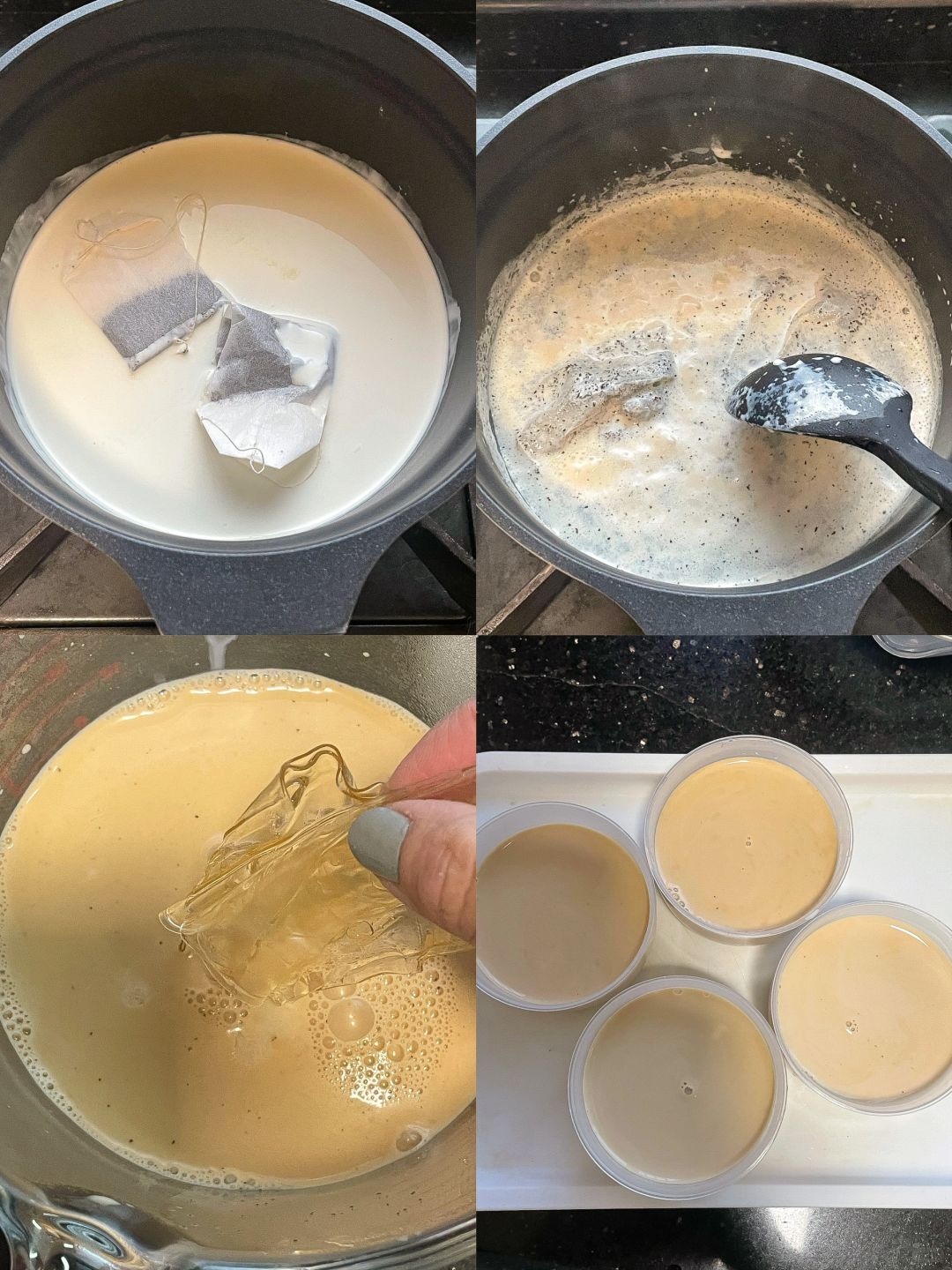 2️⃣将煮好的奶茶过滤掉茶渣,加入冷水泡软的吉利丁片,搅拌均匀,倒入布丁杯中,冷藏4个小时