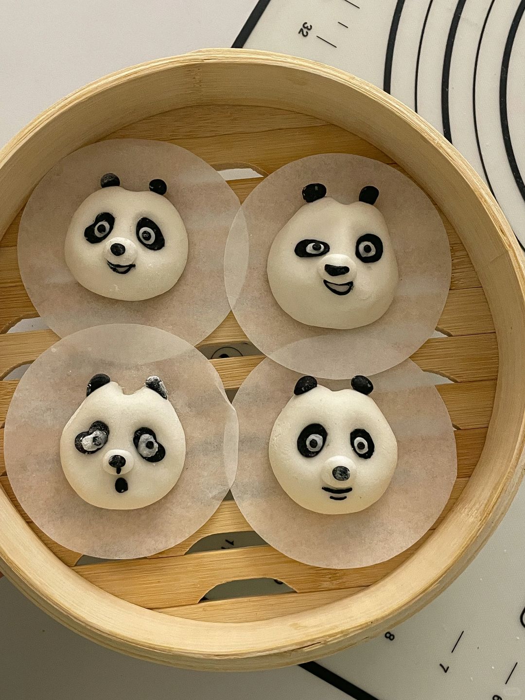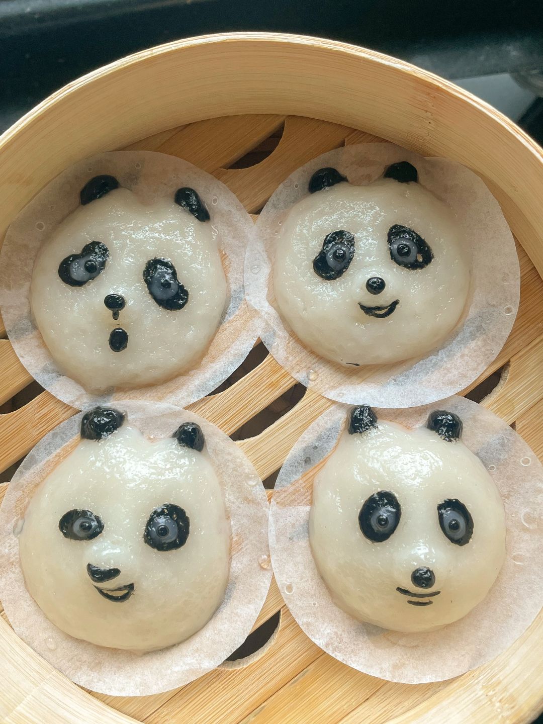 3️⃣做好的熊猫丸子上锅蒸熟,蒸好的丸子放到凉开水里脱油纸,放到奶冻上面就可以了