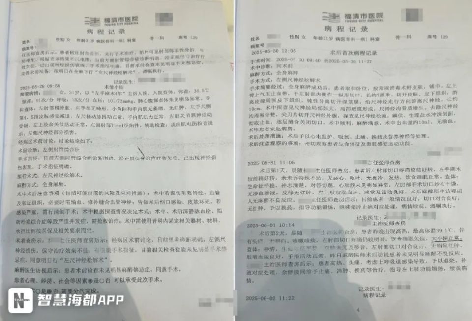 5月29日,小婷因左手两指发麻前往福建医科大学附属福清市医院就诊,被诊断为“左侧肘管综合征”。次日,她接受“尺神经松解术”,本以为是小手术,却不想噩梦就此开始。