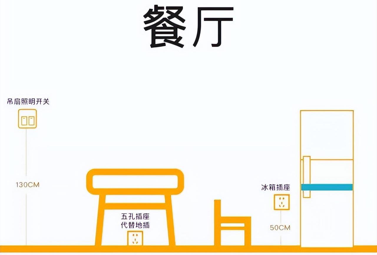 在距地130㎝处留有一个餐厅照明开关,如果餐厅安装风扇,则要留有风扇控制器。