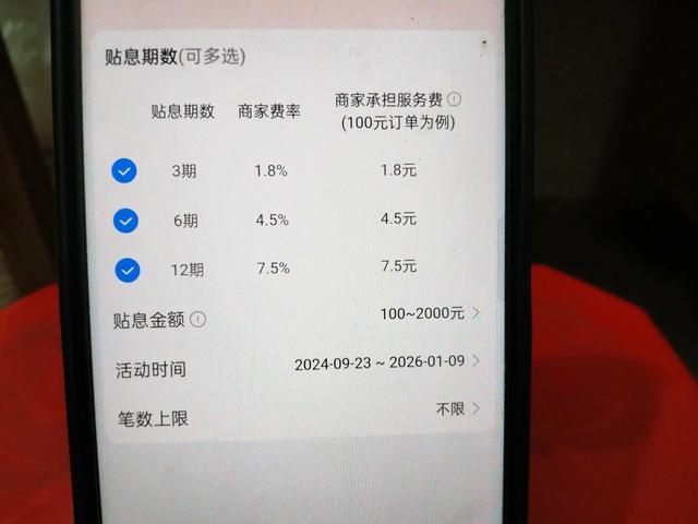 默认情况下,系统会自动开启三期、六期和十二期分期选项,但它们之间的费率差异显著。如果仅开启三期分期,商家费率为1.8%,每100元需承担1.8元的服务费;若开通6期,费率则升至4.5%,商家需承担4.4元;而十二期的费率更是高达7.5%,每100对应的服务费为7.5元。(如上图所示)