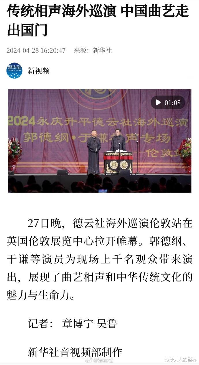 德云社海外演出,被官媒报道,得到官媒认可,并不是第一次。去年,德云社开启欧洲巡演,伦敦演出结束后,新华社就给予了肯定。