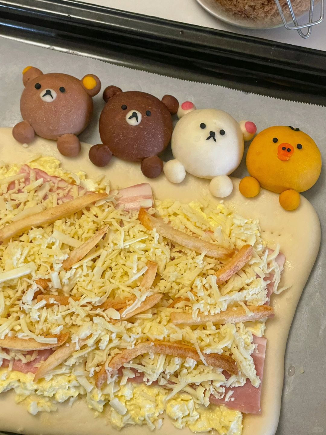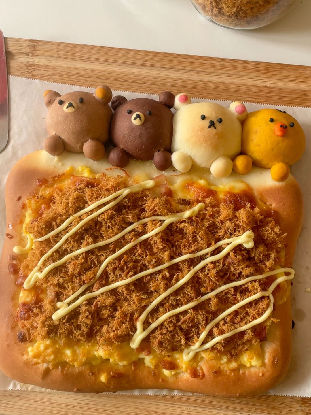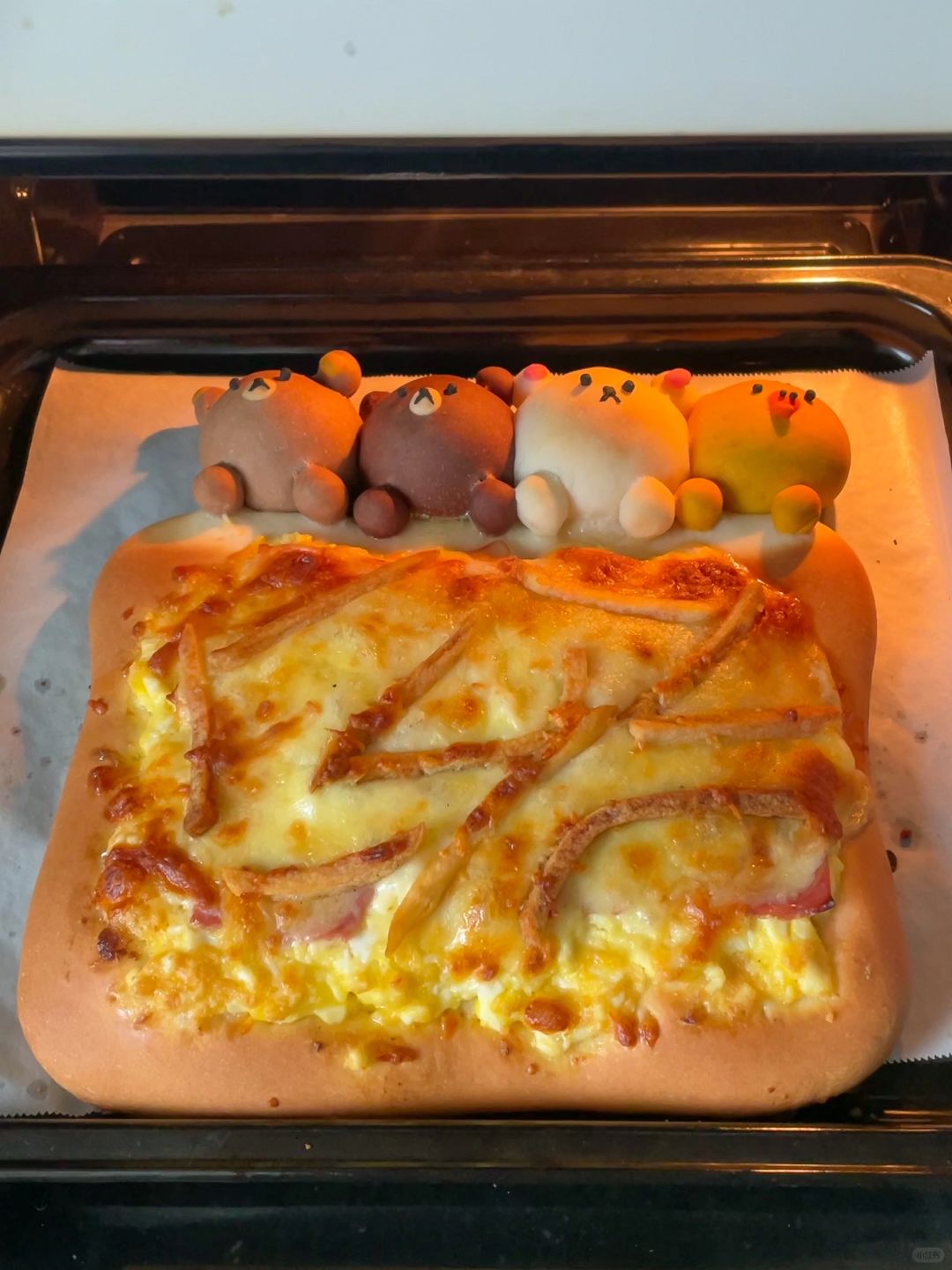 5️⃣烤箱预热后210度烘烤25分钟,烤五分钟后给小熊们盖上锡纸,烤好的披萨出炉后撒上肉松和沙拉酱