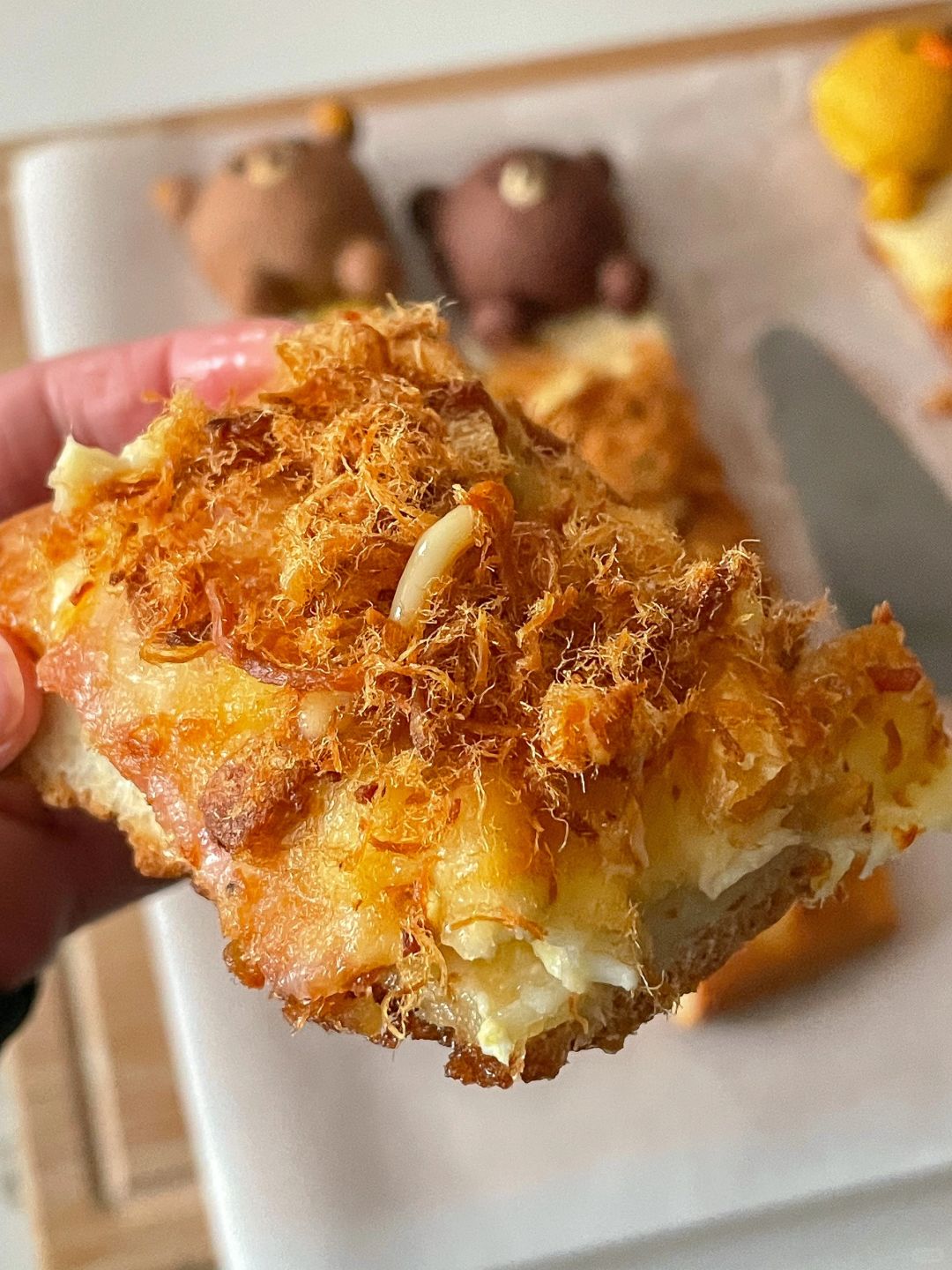 香甜松软的饼底铺满了蛋黄酱 芝士 培根 薯条还有满满的肉松