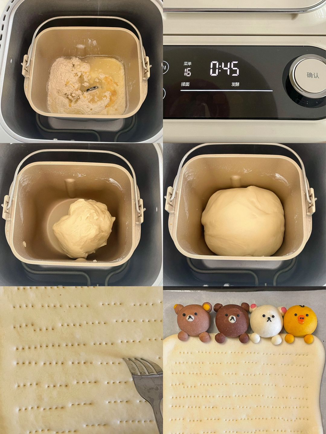 2️⃣发酵好的面团按压排气,分120g出来做轻松熊,剩余的面团擀成长方形,用叉子扎孔