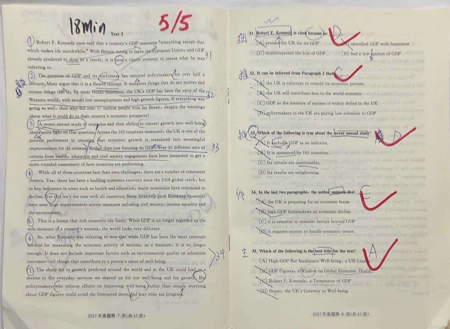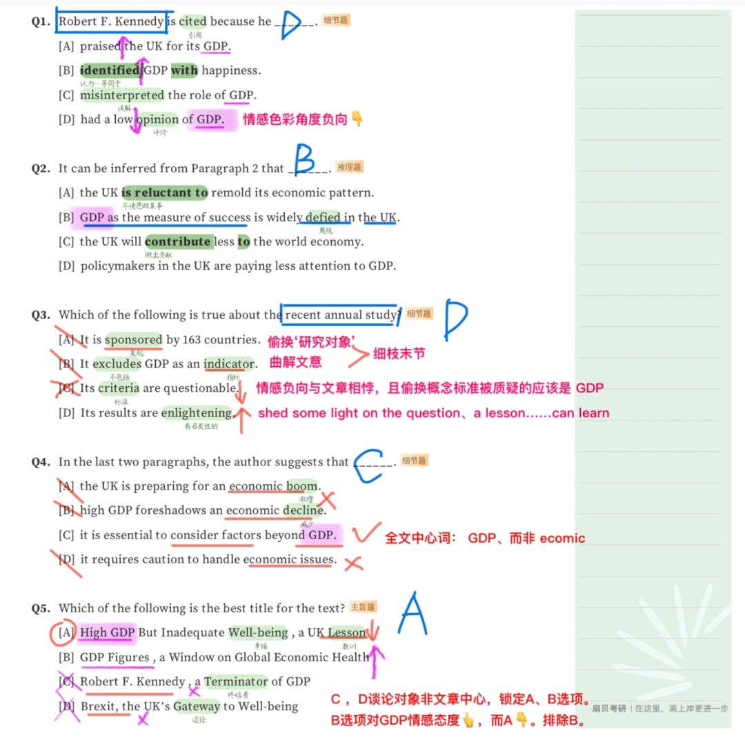 参考(唐迟方法论➕黄皮书解析) ~~~~~~~~~ 🌟全文思路: 文章首两段质疑GDP的观点,并聚焦“英国脱欧事件”予以强调;第三至五段则以近期研究发现“英国及其他主要经济体未能将高GDP转化为民生福祉”暗示高GDP并不等同于国民幸福; 第六、七段则明确指出“GDP无法衡量环镜质量,教育成果等关乎民生的重要因素,因此政策制定者不能 🌟全文逻辑 第1⃣️段:借罗伯特言论引出 GDP 第2⃣️段:一轮质疑GDP:英国脱欧事件 第3⃣️段:二轮质疑GDP:英国在将经济增长转化为民生发展方面表现极差 第4⃣️段:三轮质疑GDP:不能全面评估一国发展 第5⃣️段:提出警告:勿将GDP作为衡量一国成就的唯一标准 第6⃣️段:明确GDP缺陷:不包含提升个人幸福感的重要因素 第7⃣️段:提出建议:不要只关心 GDP数值,应着力提升社会福利 🌟技巧总结 1⃣️情态动词(should、would、could、mustcanmay、mightneed、ought to等)之后往往会出现作者的主观看法或愿望,自然也就和作者的观点态度相关,进而与全文的中心思想相关。 🌟中心思想题 1⃣️串线法:通读各段主题词,找主题词,(各段主题词重复词) 2⃣️主题词:多为各段首句,若第二句有转折(But /yet),主题词后移,为第二句。 🌟把握大方向提高做题速度❗️ ♦️33❓思路: A、B 选项发起人 、指标均为 细枝末节信息,排除。 C 情感负向与文章相悖,且偷换概念标准被质疑的应该是 GDP,排除。 D:shed some light on the question、a lesson……can learn。解决问题,可以学到——启发。 34❓思路: 全文中心词: GDP、而非 ecomic,直接选C。 35❓思路: C ,D谈论对象非文章中心,锁定A、B选项。B选项对GDP情感态度👆,而A👇。排除B。