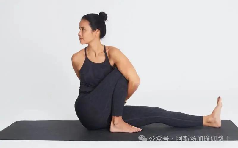 从ardha padmasana(半莲花)开始,将左脚放在相反的腿上,弯曲另一条腿,将脚放在地板上。慢慢地向下屈,直到你的下巴与弯曲腿的膝盖处于同一高度。用右臂环绕弯曲的腿,在背后抓住另一只手。如果不能,可以抓住手指或使用瑜伽带,保持这个姿势30秒到1分钟,深呼吸。然后在另一侧重复。Marichyasana CMarichyasana C也是一个高级变体,不要忘记倾听你的身体,不要强迫。