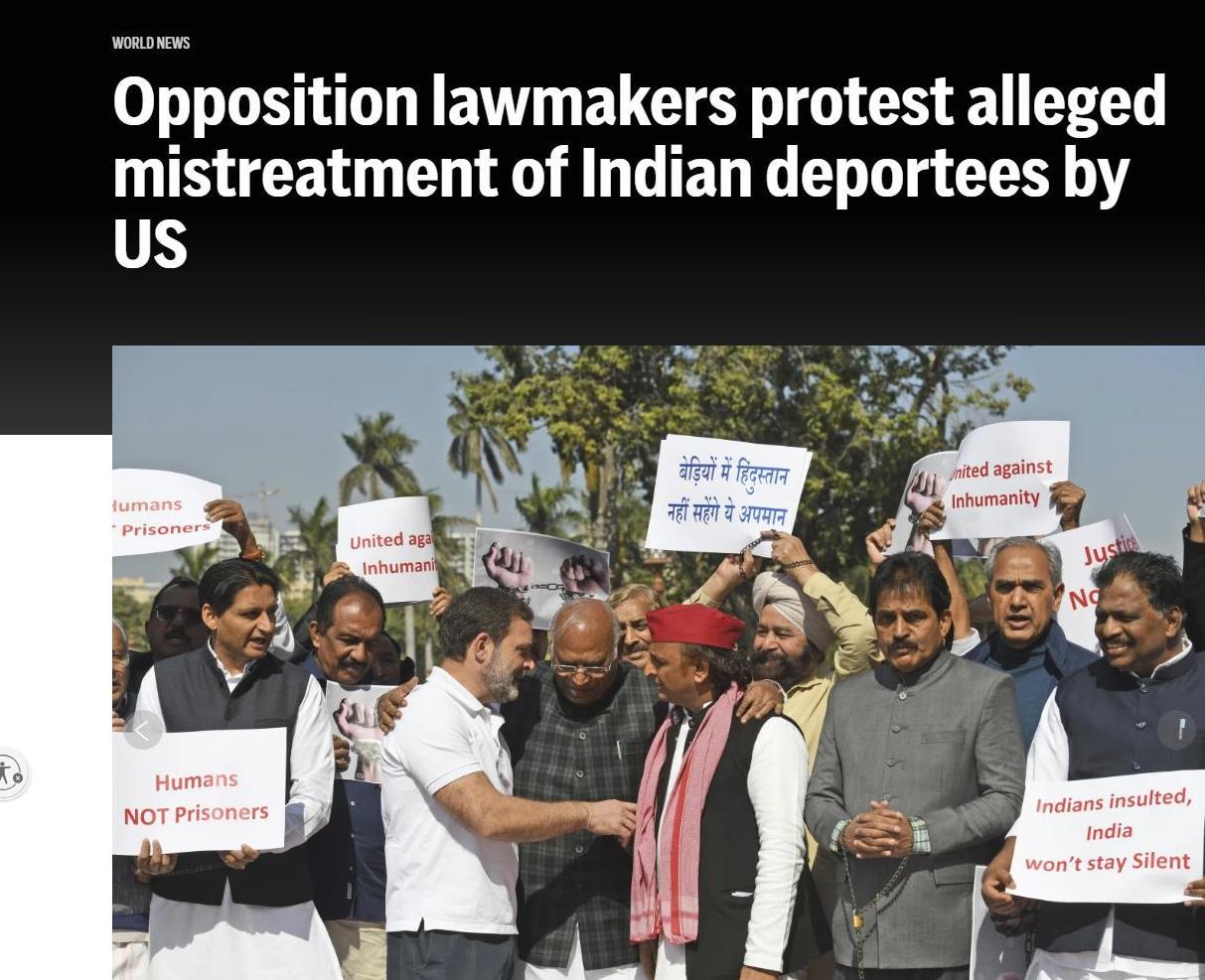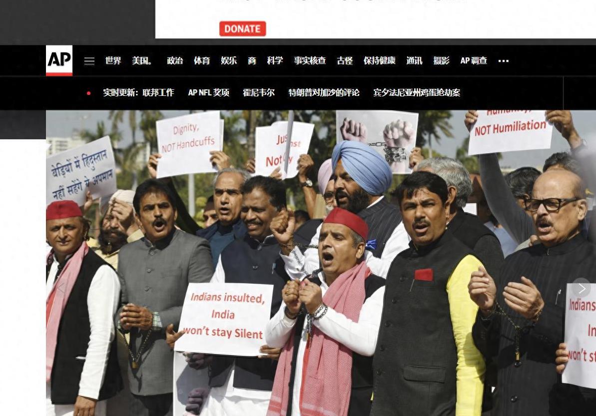 当时,印度议会因反对派成员质疑美国政府对被驱逐印度移民的待遇而陷入混乱。这些议员展示了强烈的愤怒,称美国对这些移民施加了非人道的对待。被驱逐的印度移民在回国的过程中居然被用脚镣和手铐锁住。