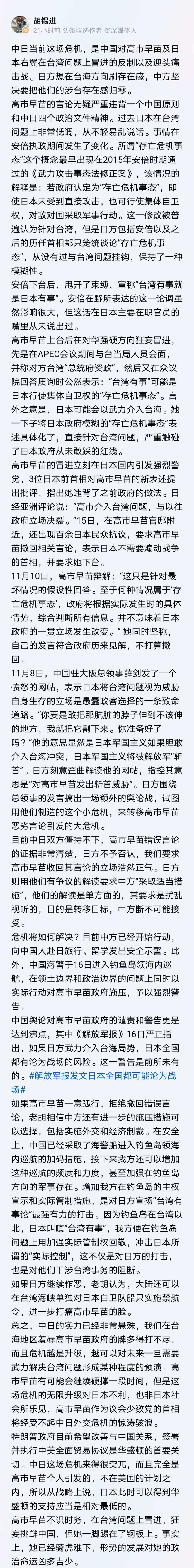胡锡进说,针对高市早苗“台湾有事,就是日本有事的”的言论,引发了中日当前的舆论危机。