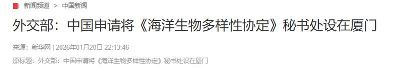 《外交部:中国申请将《海洋生物多样性协定》秘书处设在厦门》新华网2026-01-20
