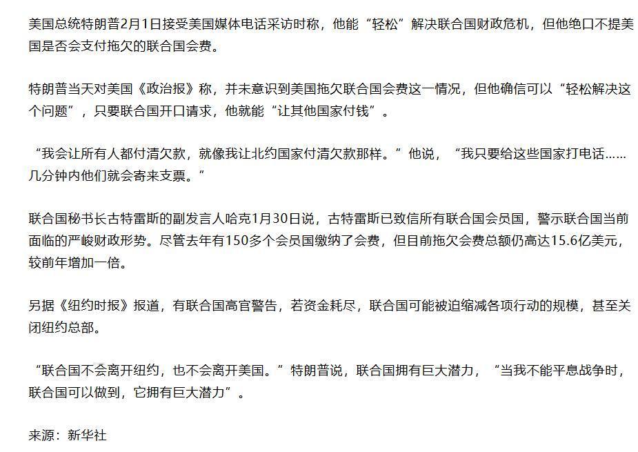 现在特朗普重新执政,这种倾向变得更加明显,他在采访中甚至将联合国会费类比成北约的军费,声称只要他给其他国家打个电话,让其他国家多出钱,缺口就能补上。