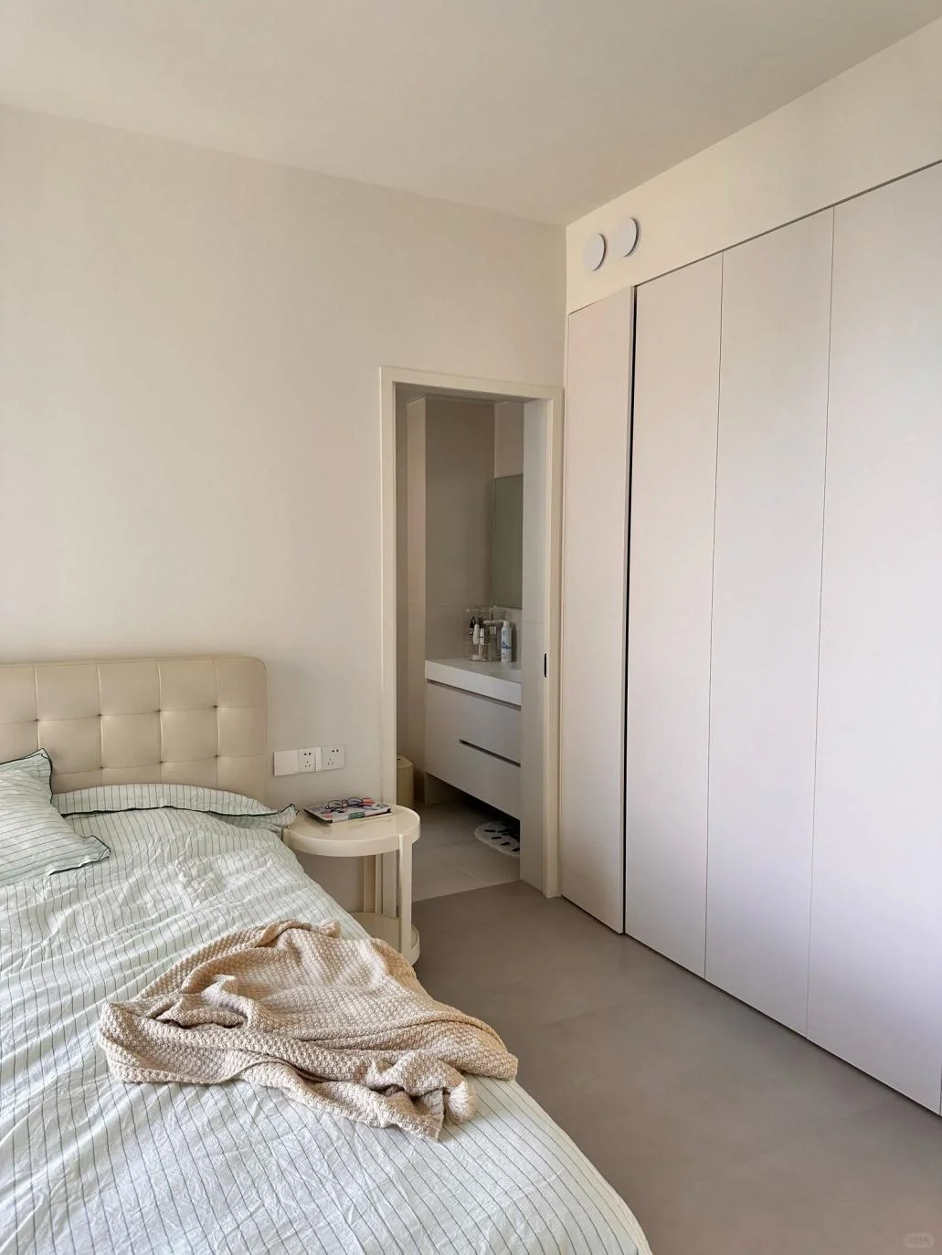 以至于很多人都问我家做的是不是微水泥呢~其实就是东鹏的奶油风岩板,卫生也很好打理 ,洗地机拖一下就干净了~