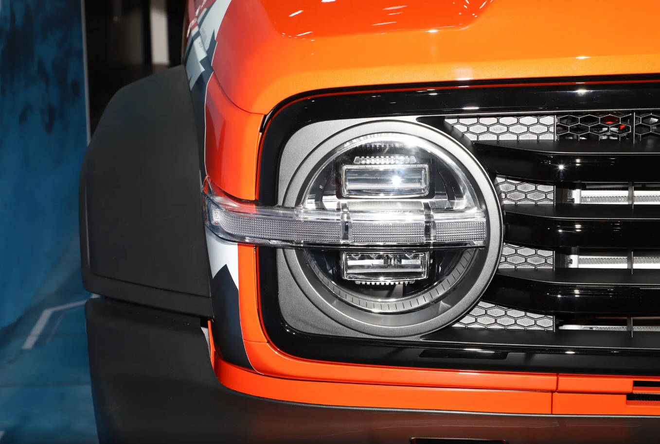 首先我们就来看它的外观设计,它的外观设计和普通版本是很接近的,因为它并没有采用专属的设计理念和设计风格。这款车型的前脸采用的是横向的进气格栅,而坦克的车标则是镶嵌在格栅中间,显得非常的粗犷与大气,而圆形的大灯与纵向的日行灯灯带会形成交互式的感觉,整个前脸让我们觉得非常的经典与时尚。车身侧面,它是一个很经典的方盒子造型,然后在车身的下方和引擎盖区域,都会配上一个专属的拉花。这个拉花类似于高山,连绵不绝的感觉,象征着他的身份,设计来到尾部,悬挂式的备胎以及侧开门的方式还是很经典的。