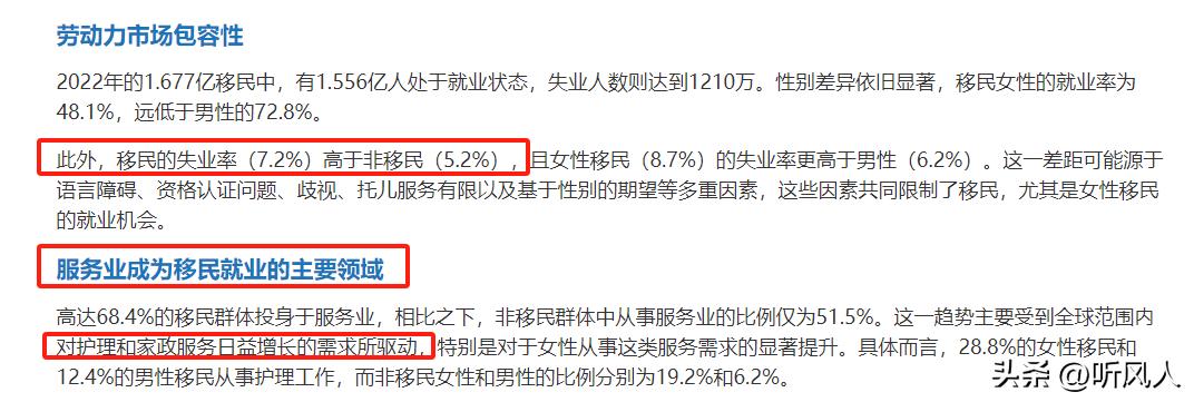 2022年国际劳工组织的数据显示,移民的失业率(7.2%)高于非移民(5.2%)。即便是那些找到了工作的移民,主要从事的,也是以护理和家政等方向为主的服务业。这一行业的移民人数,占移民总人数的比例,高达68.4%。