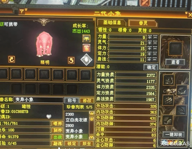一个是今天新鲜出炉的杰出粉色精明小象,力量资质2372,体力资质2335,身法资质1967: