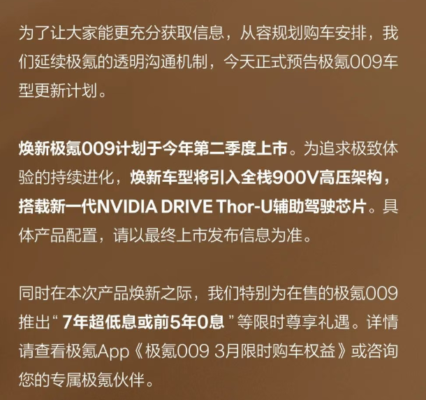 最典型“信息不对称”,主要问题集中在新车改款,汽车更新的节奏快得让人措手不及,往往让刚买现款的车主瞬间陷入“背刺”困境。针对这一核心痛点,向来“听劝”的极氪选择发起提前公示、公开透明的方式,杜绝用户尴尬。比如今年3月初,极氪就主动对旗下009车型的更新计划进行预告,提前让用户知晓产品规划,从容安排购车节奏,彻底杜绝用户刚提车就面临改款的尴尬。