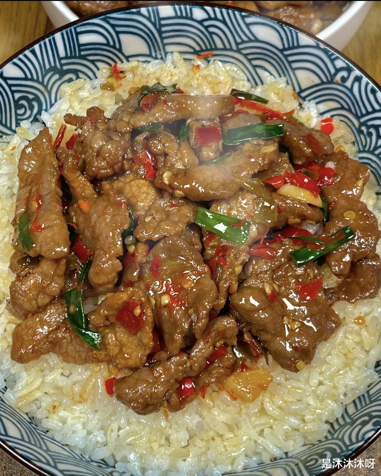 一盘色香味俱全的双椒炒牛肉就大功告成了。牛肉片色泽红亮,裹着诱人的酱汁,青红椒鲜艳欲滴,蒜香、肉香、椒香混杂在一起,直往鼻子里钻。夹一筷子送进嘴里,先是感受到牛肉的滑嫩,汁水在嘴里爆开,紧接着是青红椒的爽脆和微辣,咸鲜适口,越嚼越香。这时候要是没有一碗米饭,简直是对这盘菜的“侮辱”。用勺子挖一勺盖在米饭上,让带着汤汁的牛肉和辣椒包裹着每一粒米,一口下去,牛肉的嫩、辣椒的脆、米饭的香,各种滋味在嘴里打架,那叫一个满足。