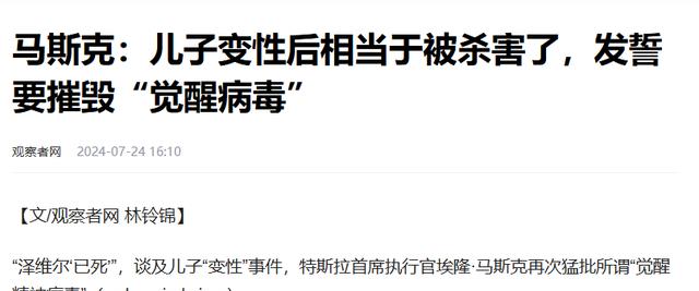 信息来源:观察者网 2024年7月24日 《马斯克:儿子变性后相当于被杀害了,发誓要摧毁“觉醒病毒”》