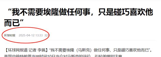 信息来源:环球时报 2025年4月12日 《“我不需要埃隆做任何事,只是碰巧喜欢他而已”》