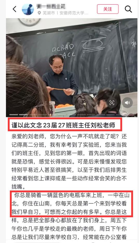 早在之前,就有学生夸赞刘松老师,提到刘松老师为人亲切,而且很爱自黑,把自己的历史课堂变的诙谐有趣,教学能力十分出色,此外还提到刘松老师有一个女儿,难以想象家人收到消息时,该有多悲伤。
