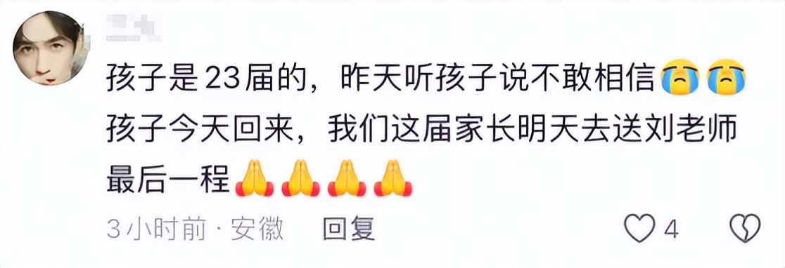还有学生听到刘老师去世的消息后,回到家中就开始痛哭,不少学生家长也会表示会去参加刘老师的告别仪式,亲自送刘老师最后一程。