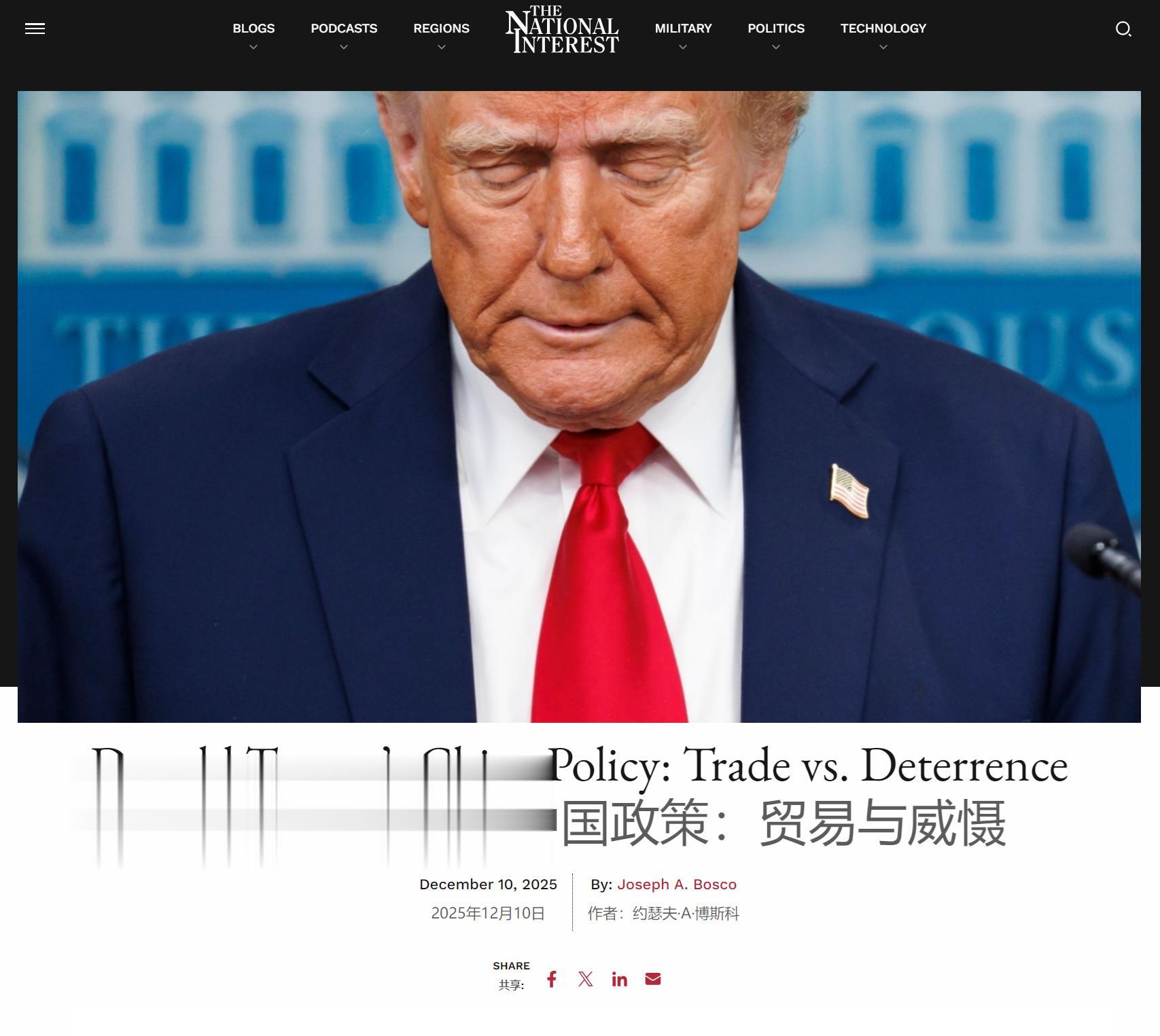 12月10日的美媒《国家利益》就发表了标题为《唐纳德·特朗普的中国政策:贸易与威慑》,其主要讨论的内容是“白宫将与中国的贸易谈判置于保护美国东亚盟友之上。”12月11日的美媒《国家利益》再次发表了以《美国的印太撤退让日本陷入困境》为标题的文章,警告美国在战略规划中将让日本承担更重要的角色,但在对台湾问题上美国并没有表明对日本的明确态度,这已经暴露出了美日安全保障的裂痕,并可能改变印太力量平衡。12月11日的德媒《德国之声》则以《特朗普新国安战略:让中国满意的美国外交?》为标题抨击美国新版国家安全战略!报道认为西半球(拉丁美洲等)已经被特朗普最新版的国家安全战略提升为优先战略区域。美国顶级智库CSIS的国家安全与科技项目主任哈丁(Emily Harding)更是在分析评论中表示“民主时代显然已经结束了。”
