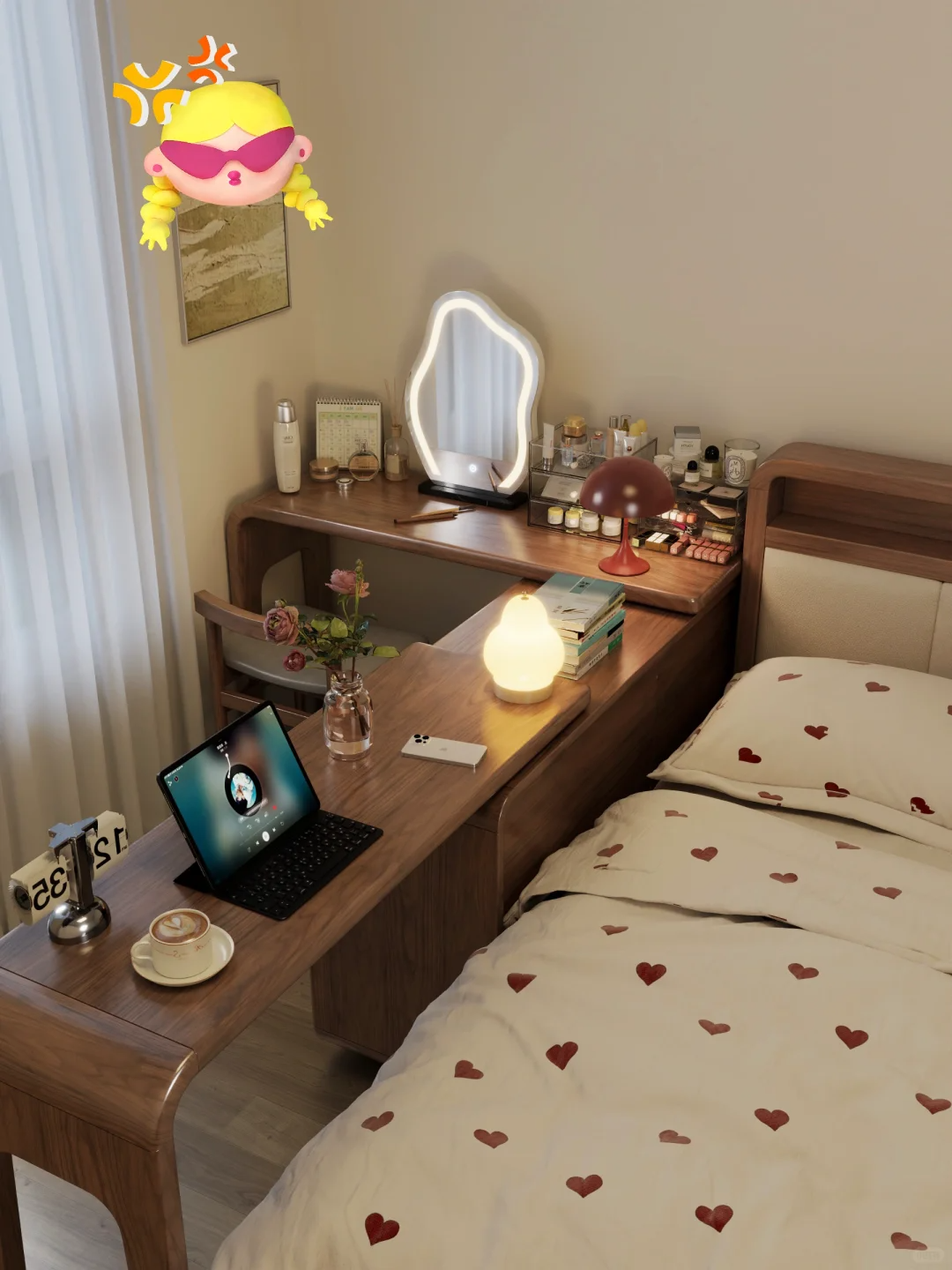 如果你是女生的话,可以把床边桌变成梳妆台和床头柜的集合体,如果你是男生的话,还可以把床边桌变成书桌,一举多得,真的是超级合适。