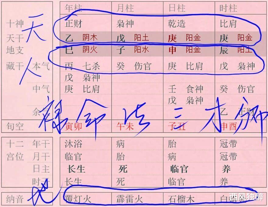 《五行精纪》中说“地元忌天元,子丑怕己”,这种三才划分的方法中,又把地支归类为地元,因此就变成了:天干为天元,地支为地元,纳音为人元了。