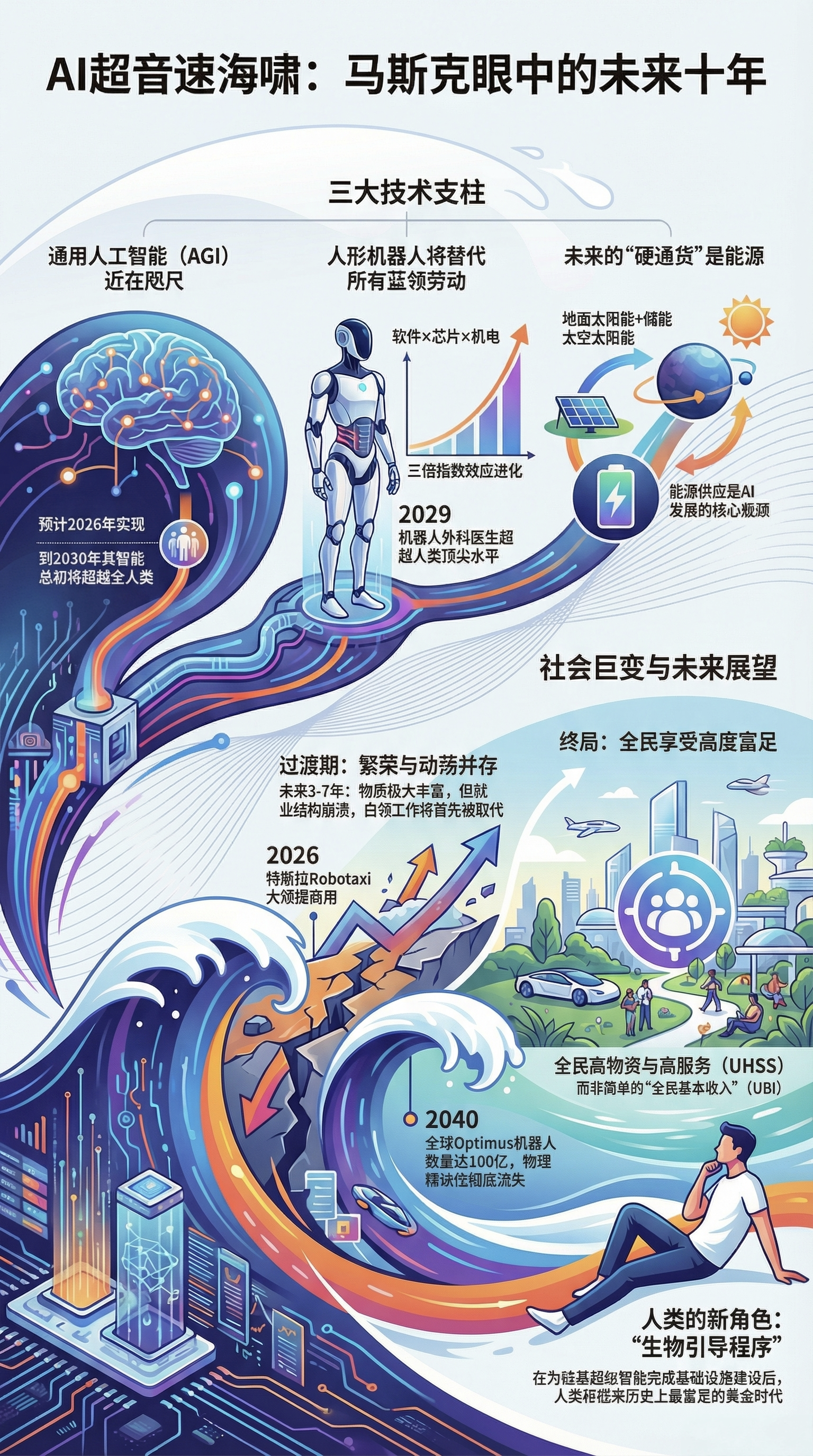 最近马斯克在他那长达3小时、信息量炸裂的访谈里,几乎是毫无保留地预测未来百年的发展。咱们正站在一个极其诡异的十字路口:一边是人类将会“神化”的前夜,一边是现实秩序被AI技术完全取代的边缘,在这个技术狂人已经开始规划“神之图纸”的时代,我们绝大多数普通人究竟是未来的主人,还是一堆亟待优化的数据?