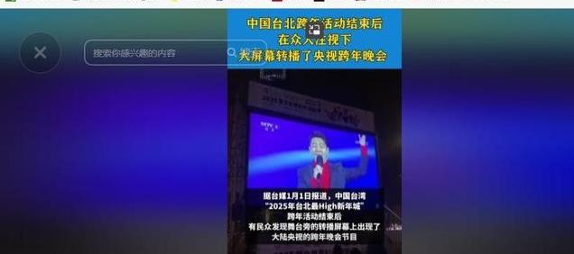 你们敢信吗?2024 年 12 月 31 日跨年夜,在台北热热闹闹举办的 “2025 最 high 新年城” 跨年晚会上,就在大家准备散场的时候,大屏幕上突然蹦出了大陆央视的跨年晚会!现场那叫一个震惊,22 万民众瞬间瞪大了眼睛,下巴都快掉到地上了,这剧情,比电视剧还精彩。