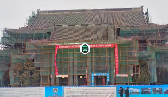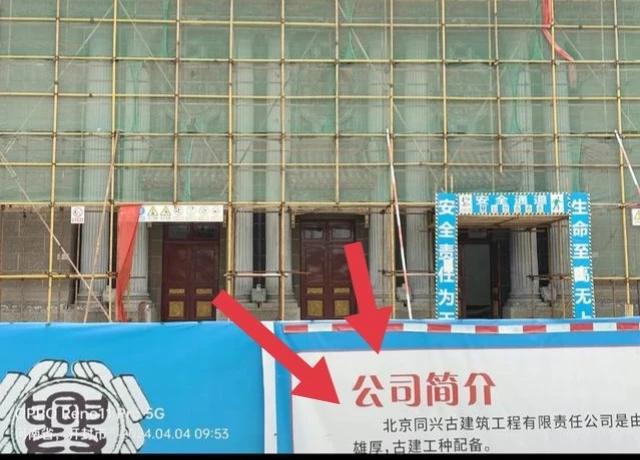 知情人挖出施工单位周围有施工挡板,大礼堂外围还有钢管脚手架和防护网,是哪家施工单位在进行修缮呢?