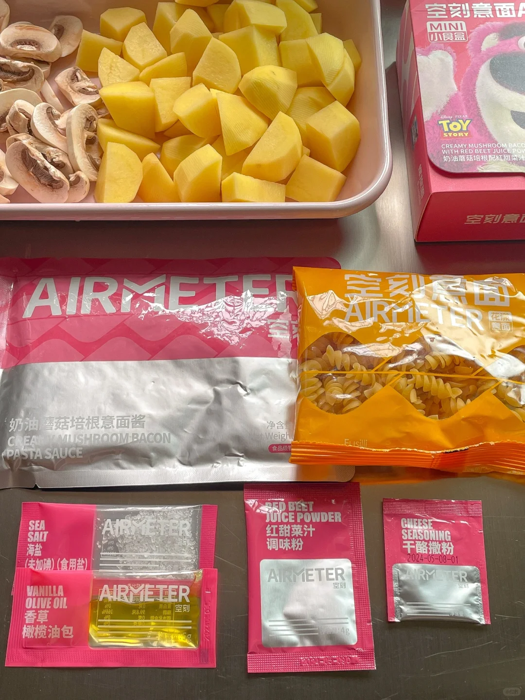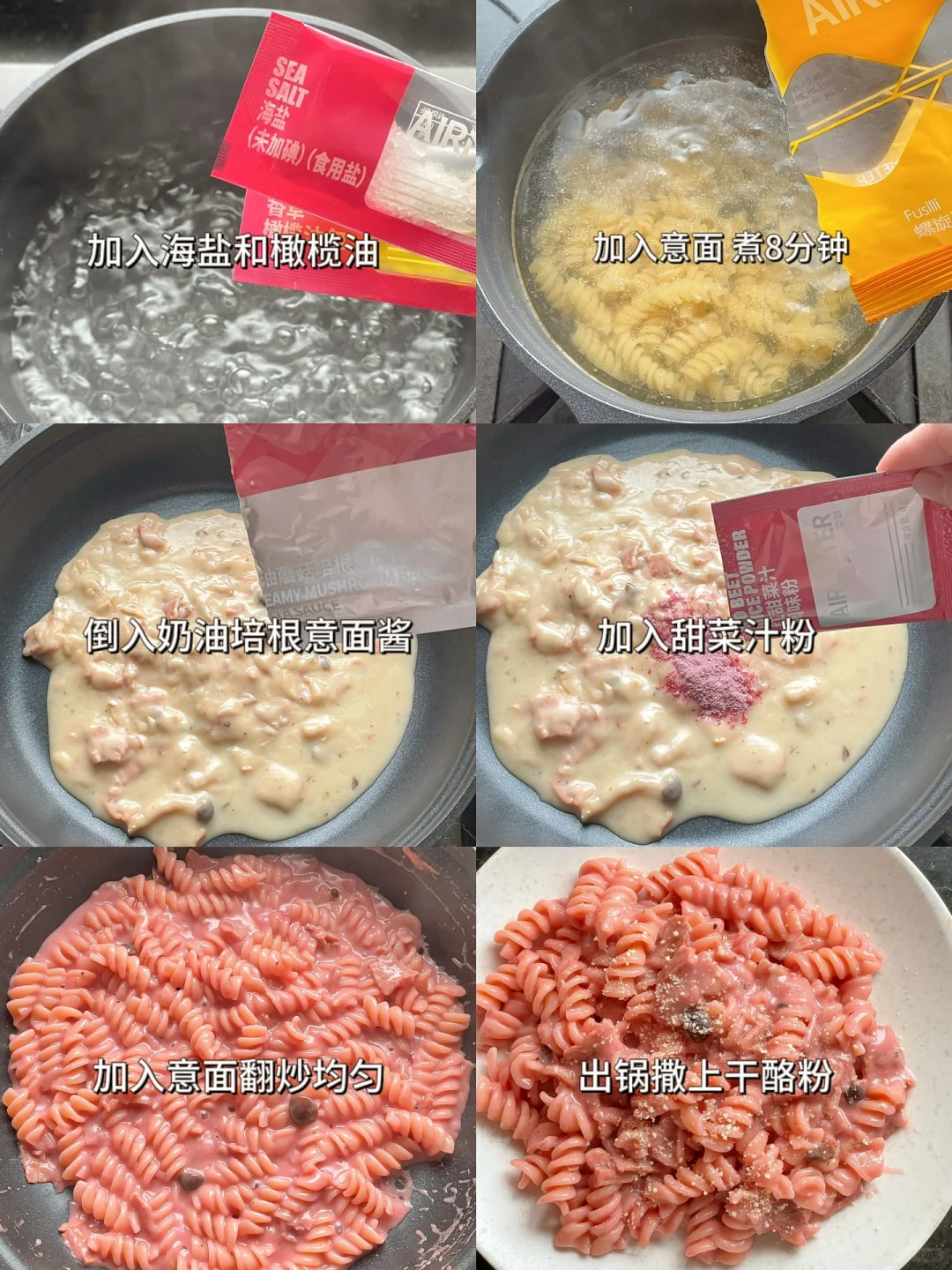 3⃣煮面的同时另起一个锅,锅中倒入适量橄榄油,将白蘑菇炒软,加入奶油蘑菇培根意面酱包和红甜菜汁调味粉包,这样做出来的意面酱就会粉粉哒