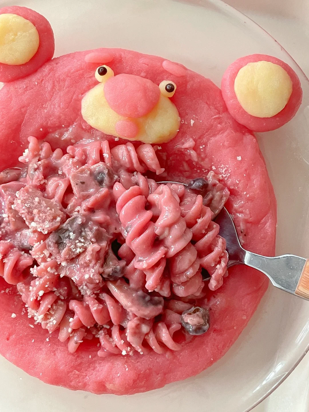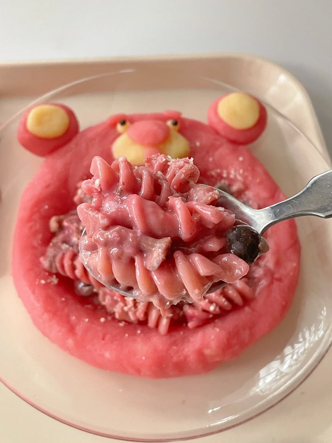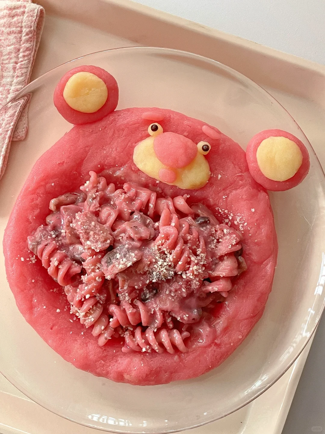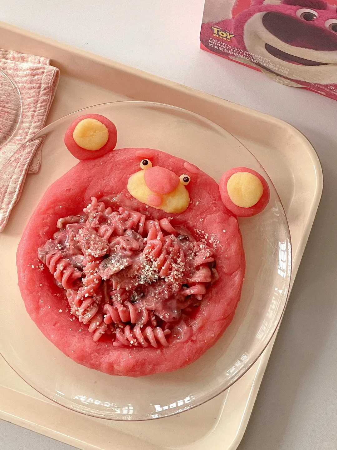 是粉嫩的草莓熊土豆泥奶油培根意面