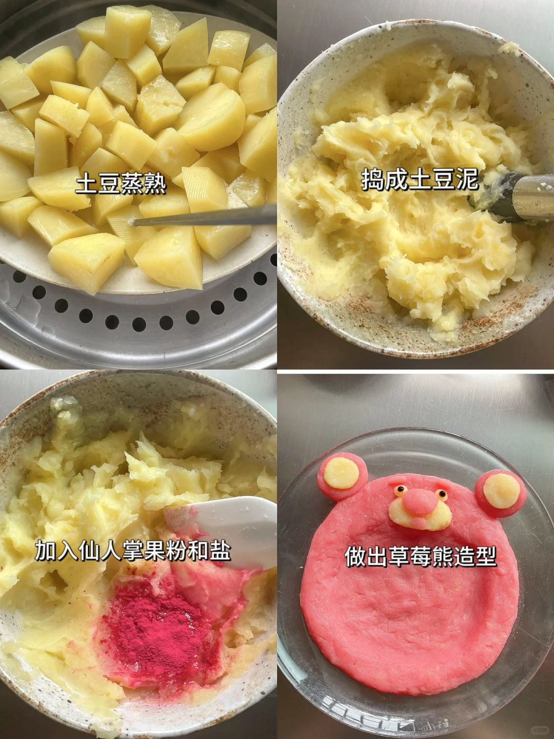 1⃣土豆泥上锅蒸熟,捣成泥后分一部分出来加入盐和仙人掌果粉调成粉色,捏出草莓熊的形状,再用巧克力酱画上眼睛