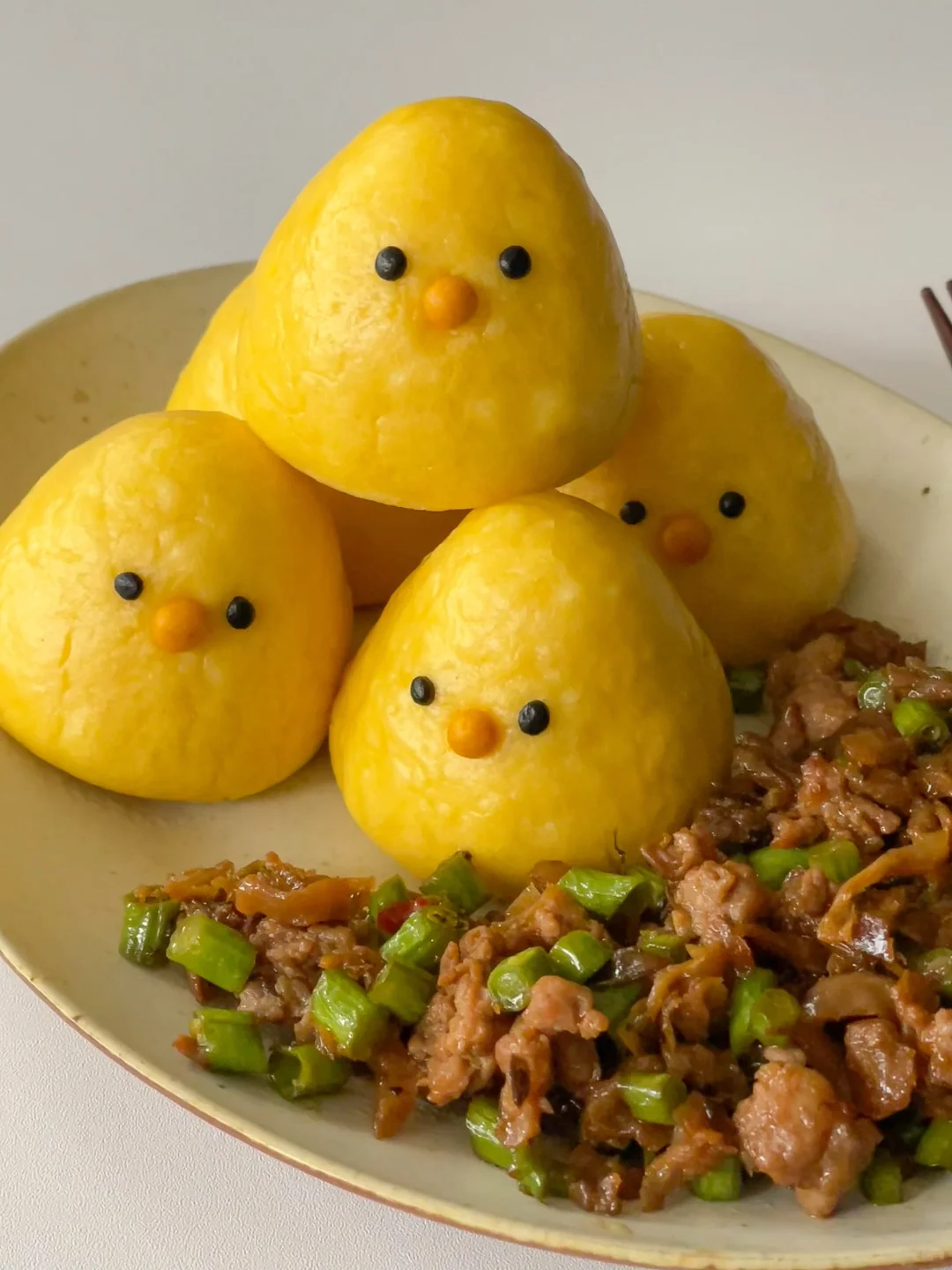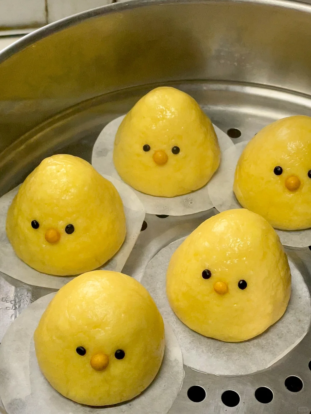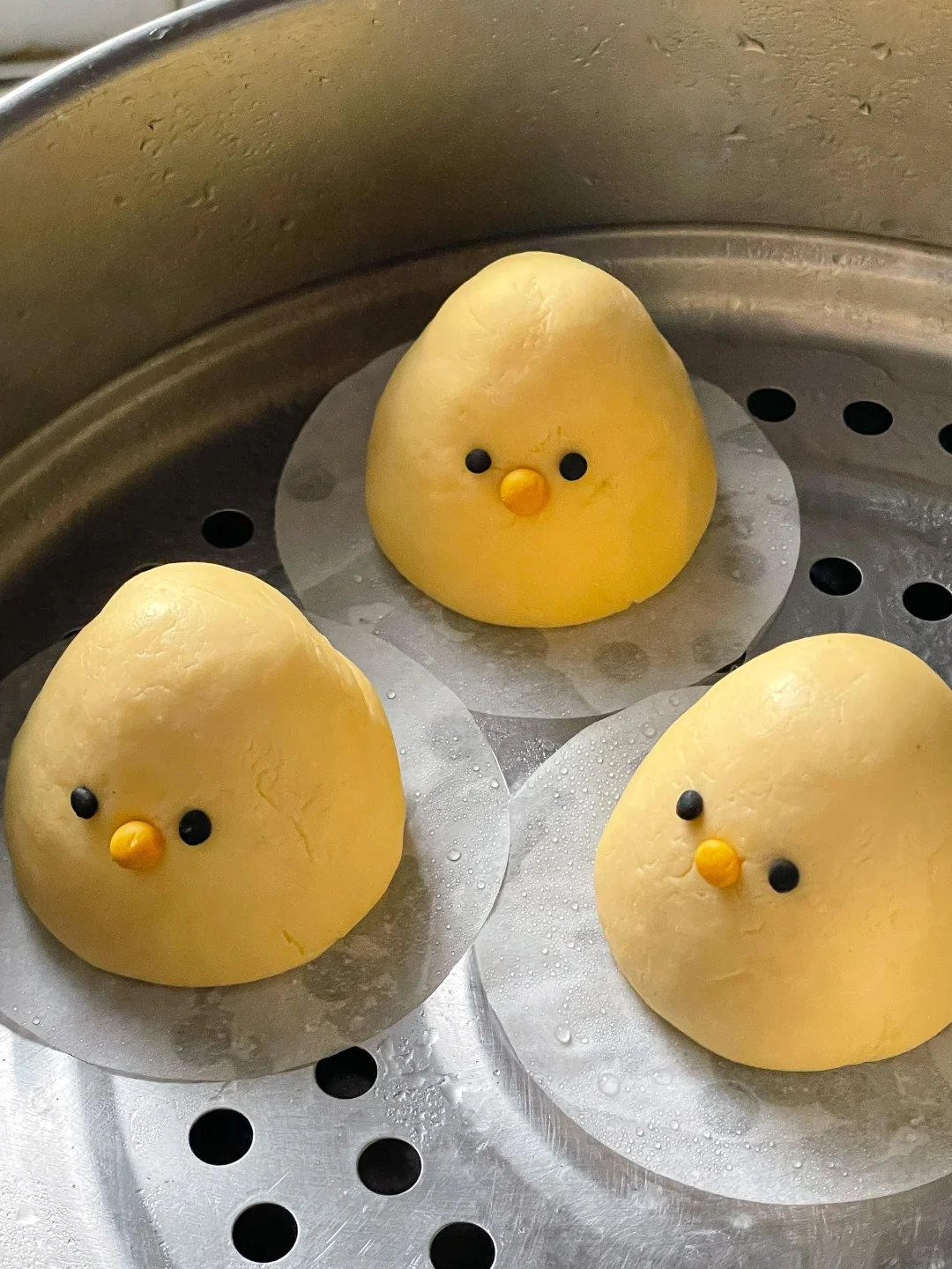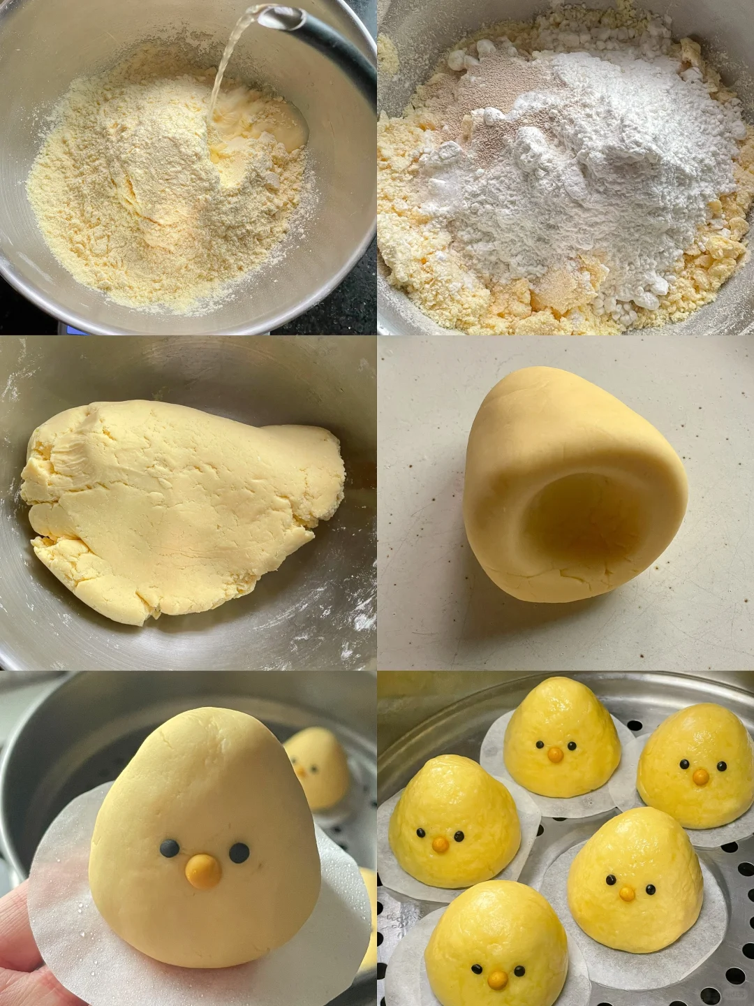 2️⃣醒发好后再稍稍揉一揉,面团会变得光滑,平均分成5份,右手大拇指撮个洞,整成窝头形状,做好后再给窝头加上表情,放在锅里发酵,发酵到整体体积变大些后,开中火蒸15分钟,闷3分钟