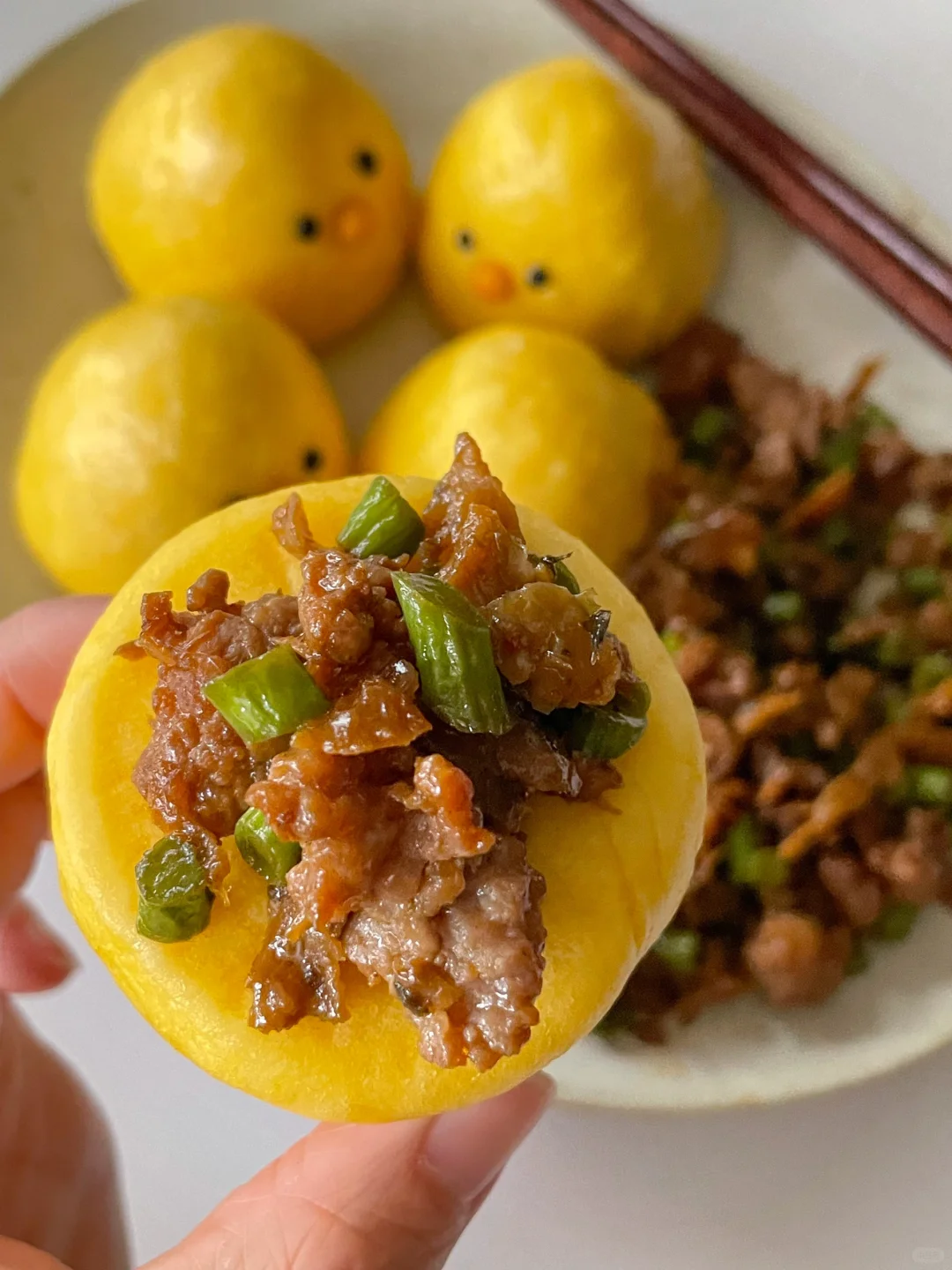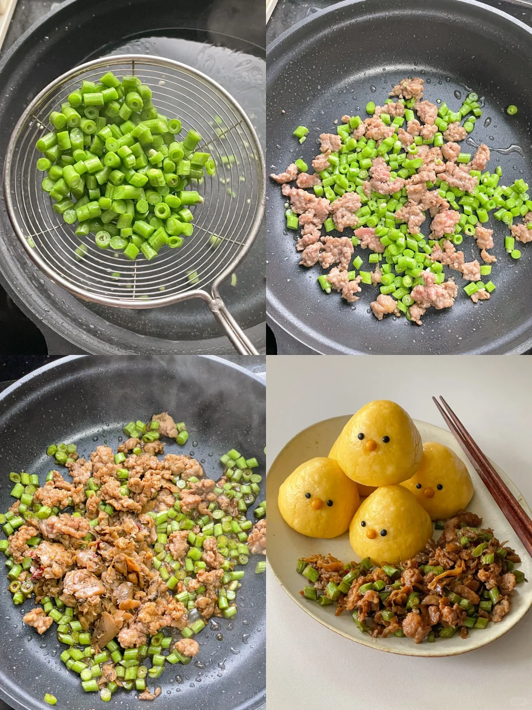 材料:玉米面125g 、中筋面粉75g、开水100g、酵母2g、盐1g、油3g、外婆菜、肉末、豇豆
