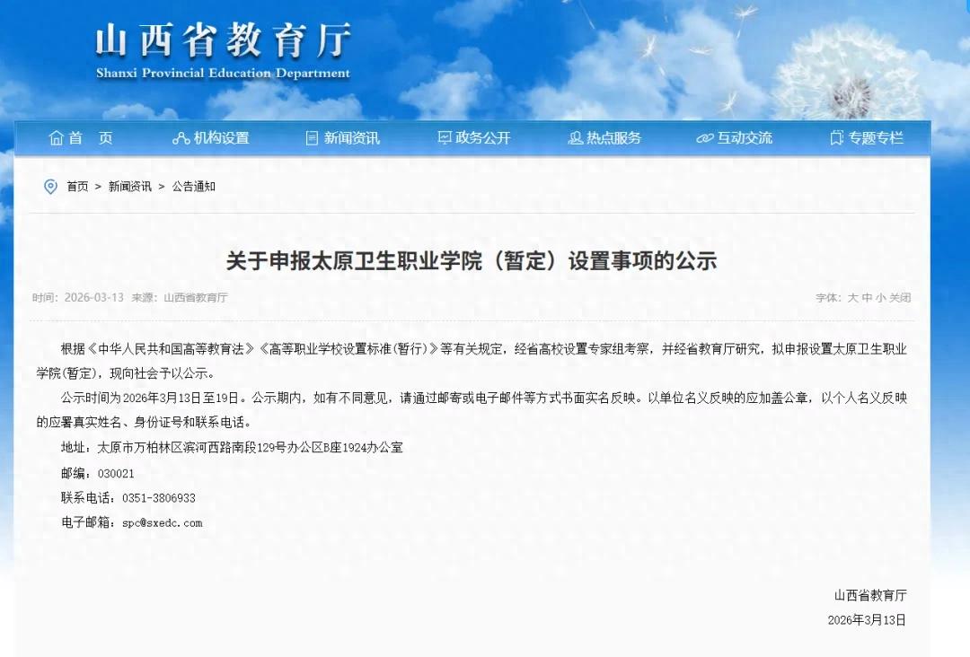 3月13日,山西省教育厅发布《关于申报太原卫生职业学院(暂定)设置事项的公示》。