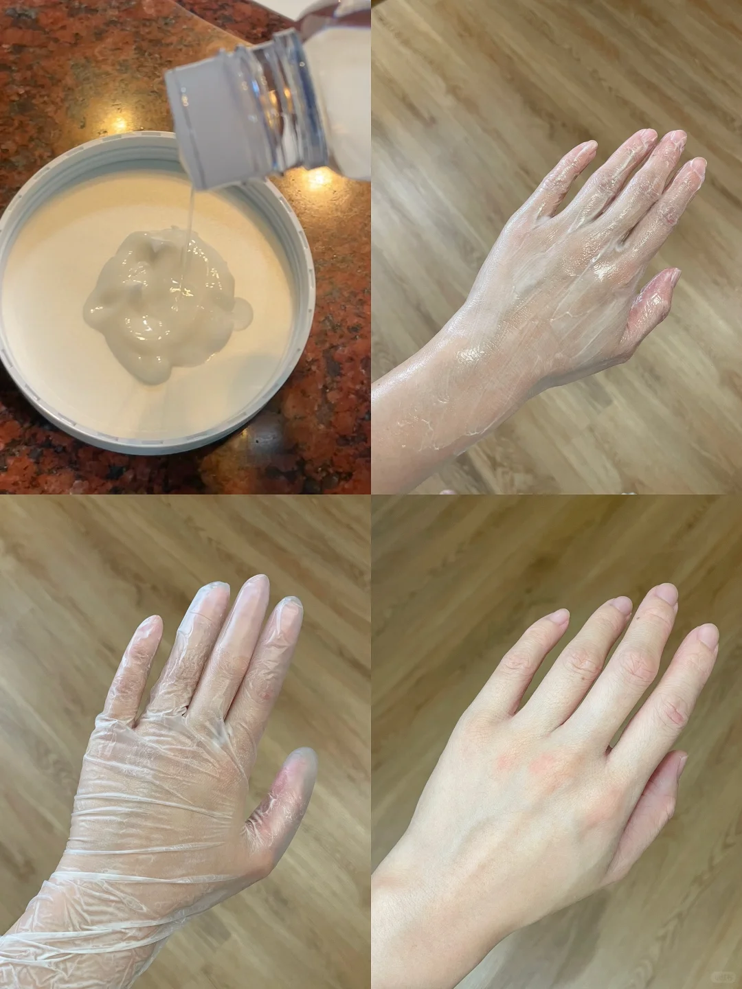 2️⃣身体乳+2-3滴强生婴儿油混合起来厚厚的敷在手上,套上一次性手套敷个20分钟,敷完也不用洗掉,就让他慢慢吸收就好啦