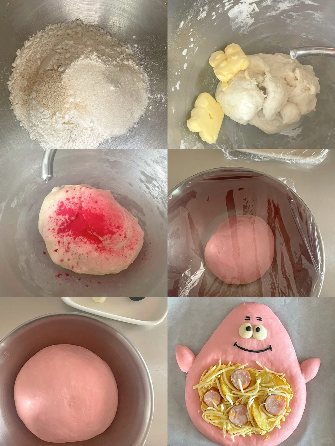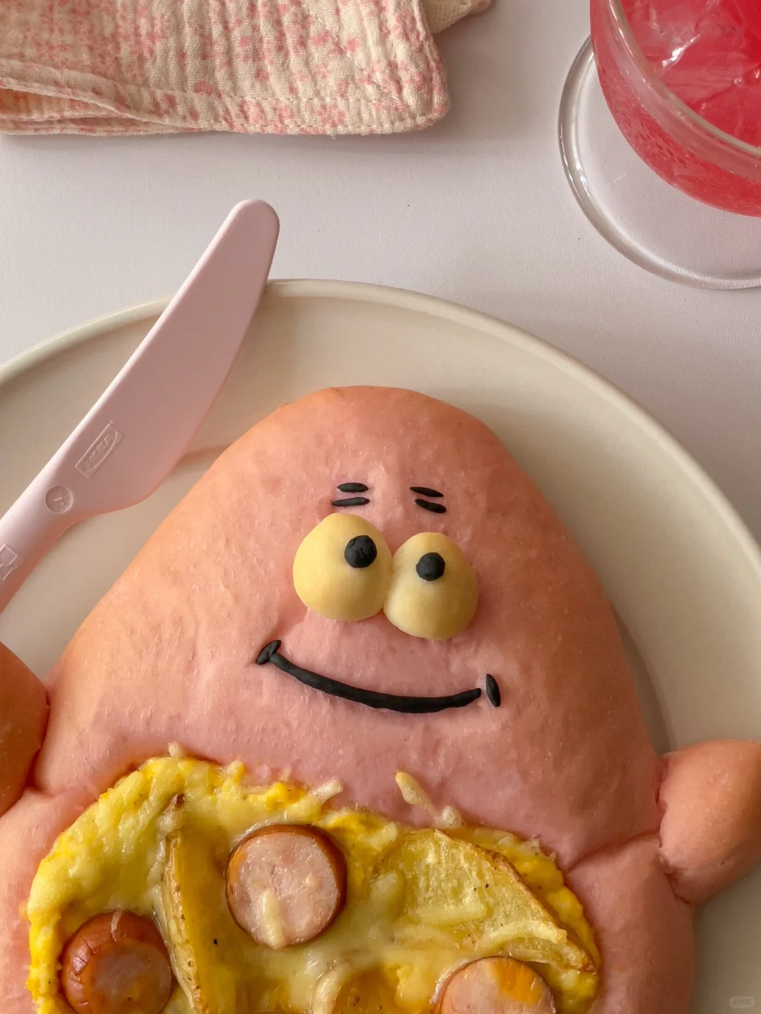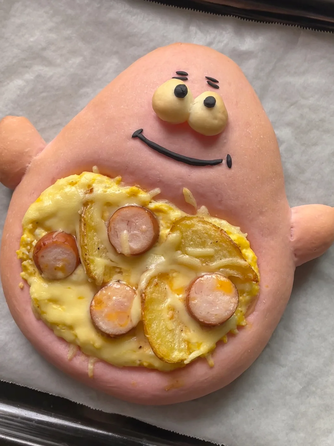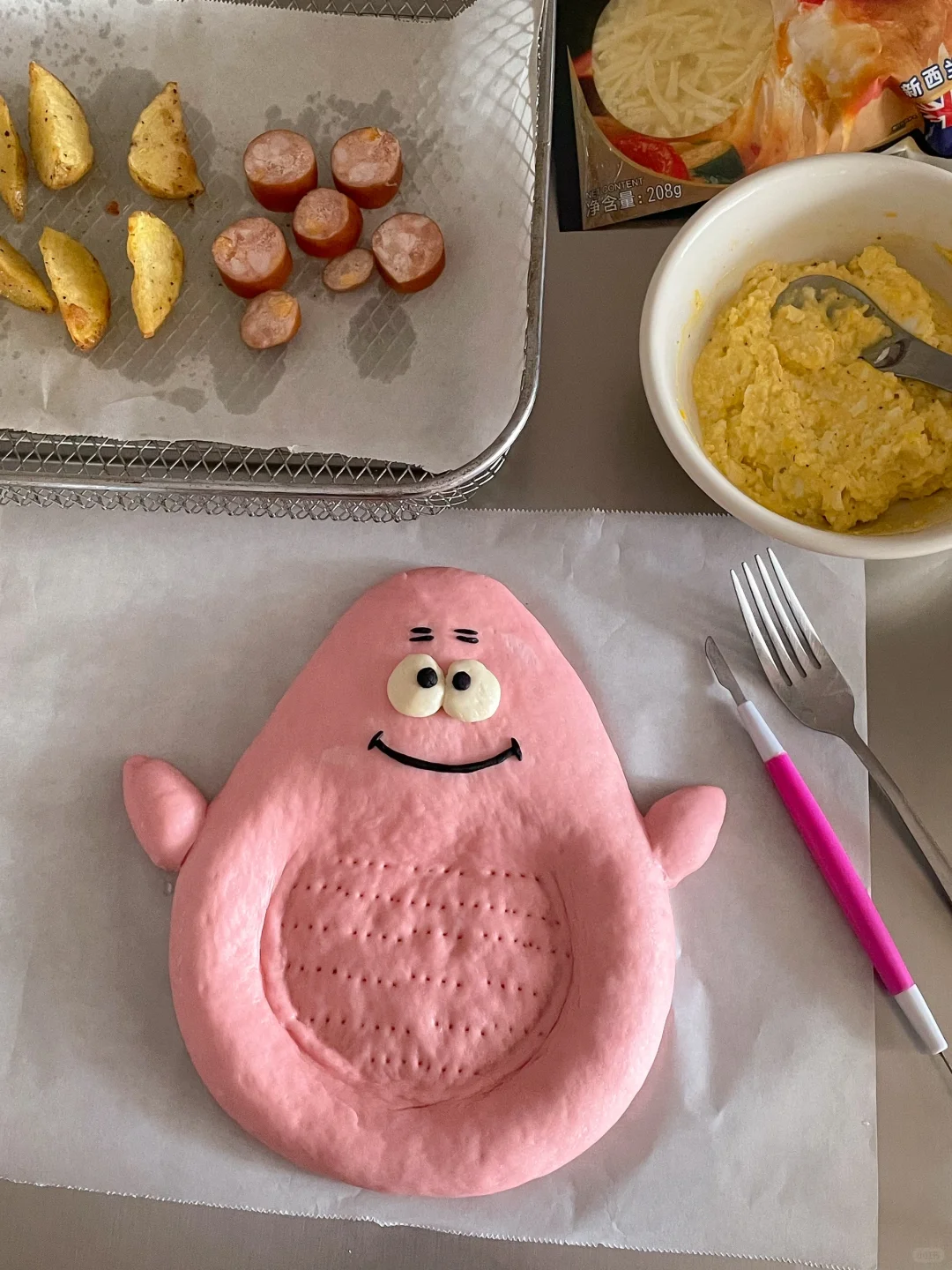 3️⃣发酵好的面团按压排气,制作出派大星的样子,依次铺上芝士碎、蛋黄酱、火腿、薯角、芝士碎